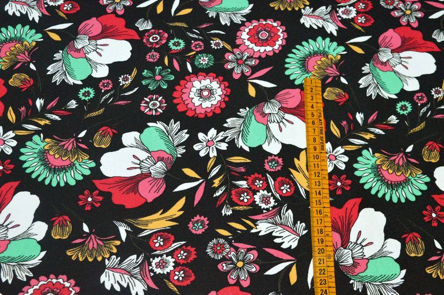 A differenziare la stoffa è la splendida fantasia floreale che unisce innumerevoli colorazioni le quali vivacizzano e decorano armoniosamente il fondo a tinta unita nero.