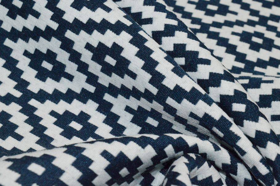 Il fondo bianco mette in risalto il motivo geometrico blu composto da rombi in stile tribale di 2,5x4,5 cm ciascuno.