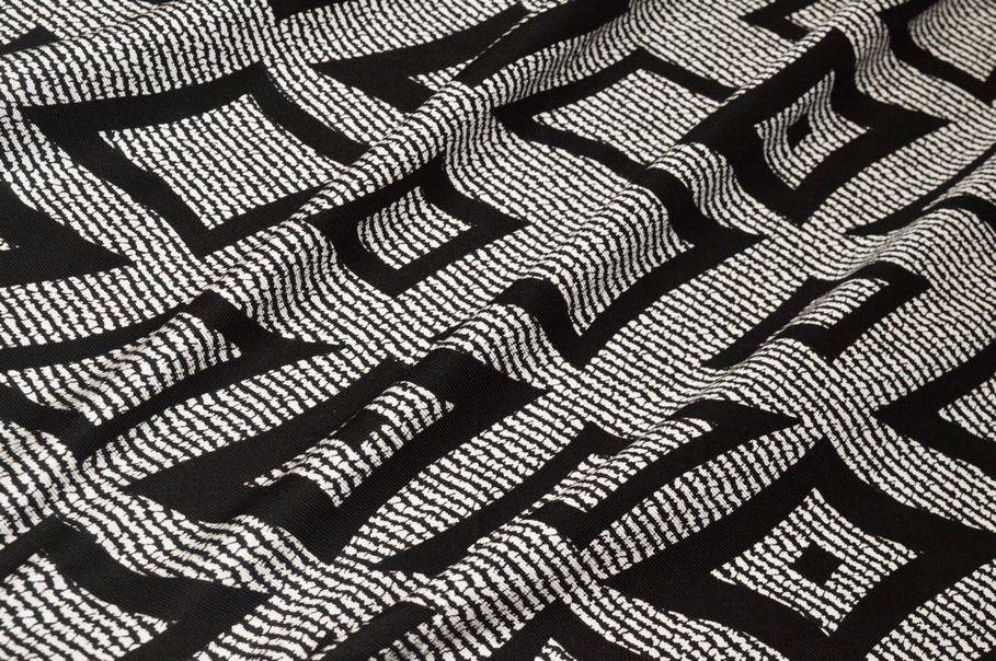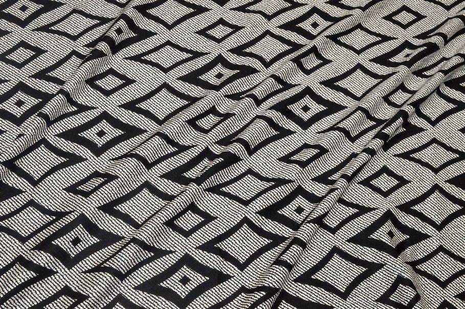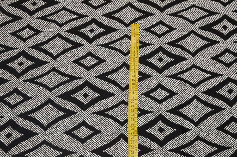 Ad affascinare è anche l'aspetto del tessuto il quale sfoggia un bellissimo ed originale motivo bianco e nero composto da rombi di differente grandezza. Indicato per abiti corti e lunghi, gonne morbide o con volant, camicette e top.