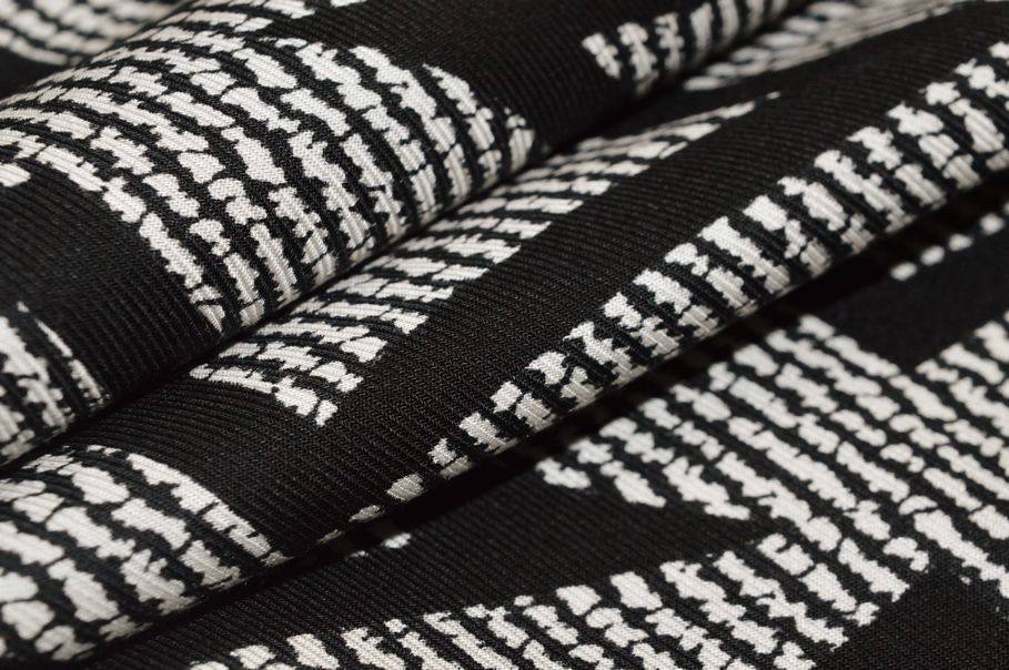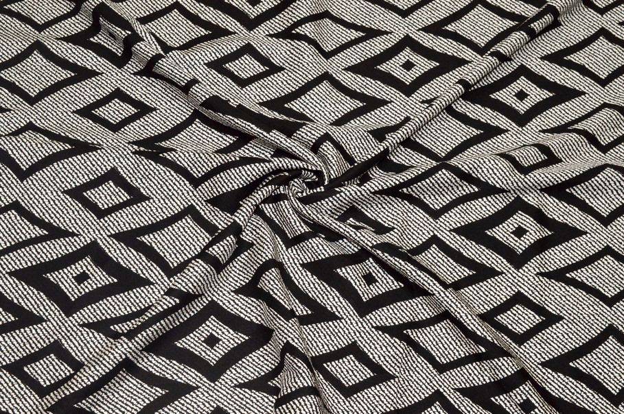 Ad affascinare è anche l'aspetto del tessuto il quale sfoggia un bellissimo ed originale motivo bianco e nero composto da rombi di differente grandezza. Indicato per abiti corti e lunghi, gonne morbide o con volant, camicette e top.