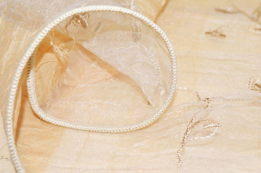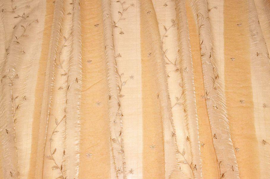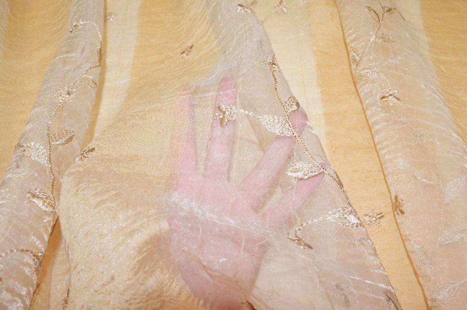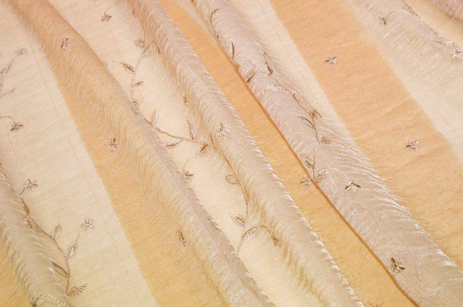 Il fondo viene realizzato con della bellissima organza beige dal sottotono caldo tendende al dorato e viene suddiviso da fasce più e meno coprenti. Le fasce trasparenti, oltre a far passare la luce, mettono in mostra un raffinatissimo ricamo dorato raffigurante minuti ed esili fiorellini. Preziosa ed elaborata, ma allo stesso tempo classica ed elegante rappresenta un vero e proprio elemento d'arredo altamente lussuoso. Realizzato con base in organza presenta una mano molto leggera e trasparente. La leggerezza del prodotto lo rende un articolo perfetto per arredare ambienti con poca illuminazione.