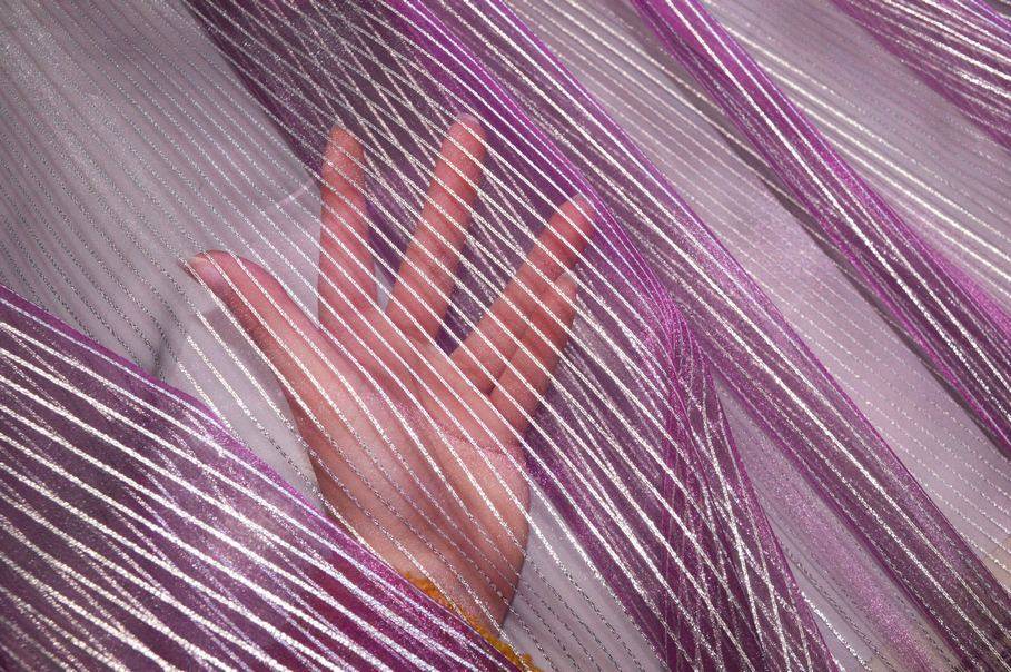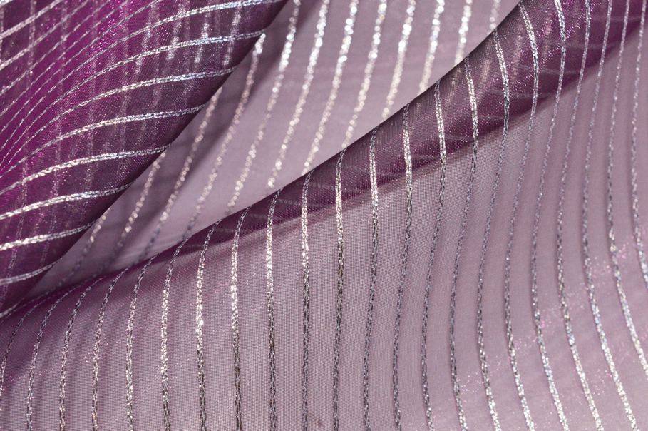 La colorazione scelta per il fondo è un particolarissimo viola che viene impreziosito da un sottile righino argenteo il quale dona alla stoffa un luccichio prezioso ed elegante. Realizzato con base in organza presenta una mano molto leggera, voluminosa e trasparente. La leggerezza del prodotto lo rende un articolo perfetto per arredare ambienti con poca illuminazione poiché la luce naturale filtrerà molto facilmente.