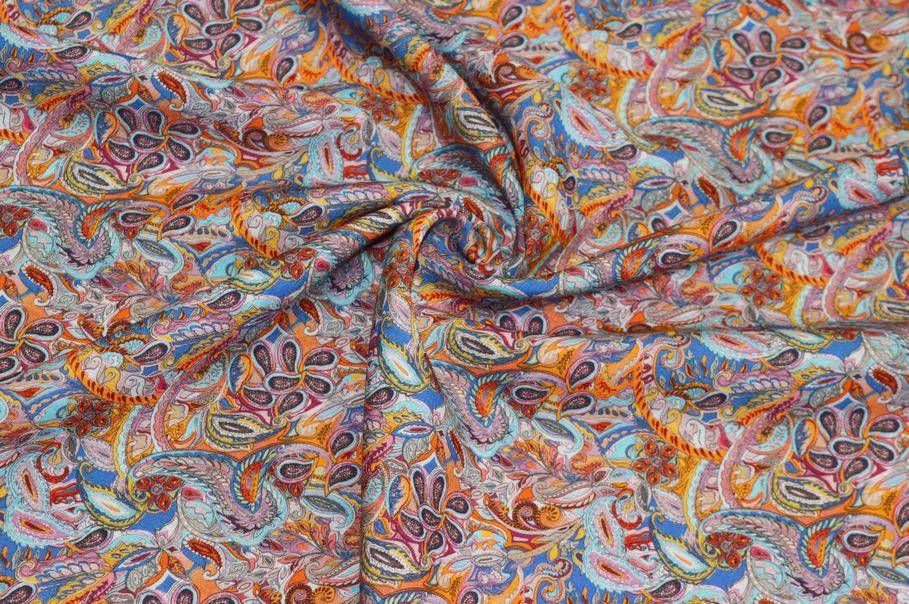 Ad abbellire la stoffa troviamo inoltre il coloratissimo ed iconico motivo cashmere composto da molteplici gradazioni di arancio che si uniscono armoniosamente a dettagli blu.