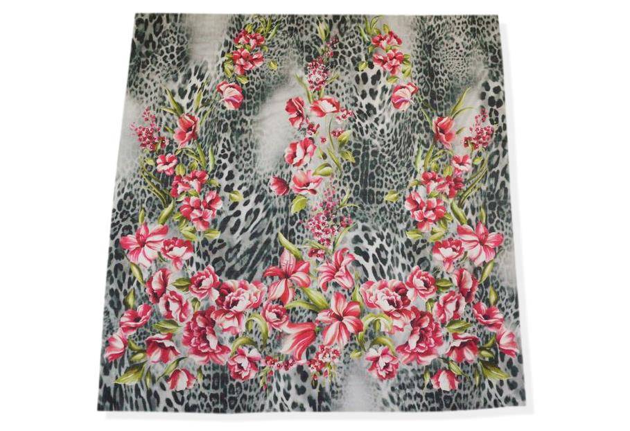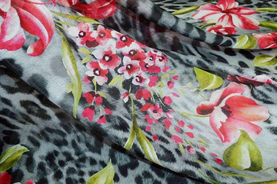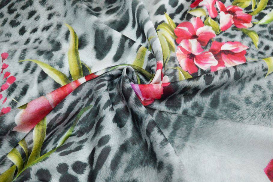 Il pannello misura 140x135 cm e vanta di una bellissima fantasia piazzata che riesce ad unire perfettamente l'eleganza delle stoffe floreali all'accattivante ed iconico motivo animalier per un design rappresentativo dell'alta moda. Indicato per confezionare top e camicette, abitini corti e lunghi, eleganti foulard e stole coprispalle.
