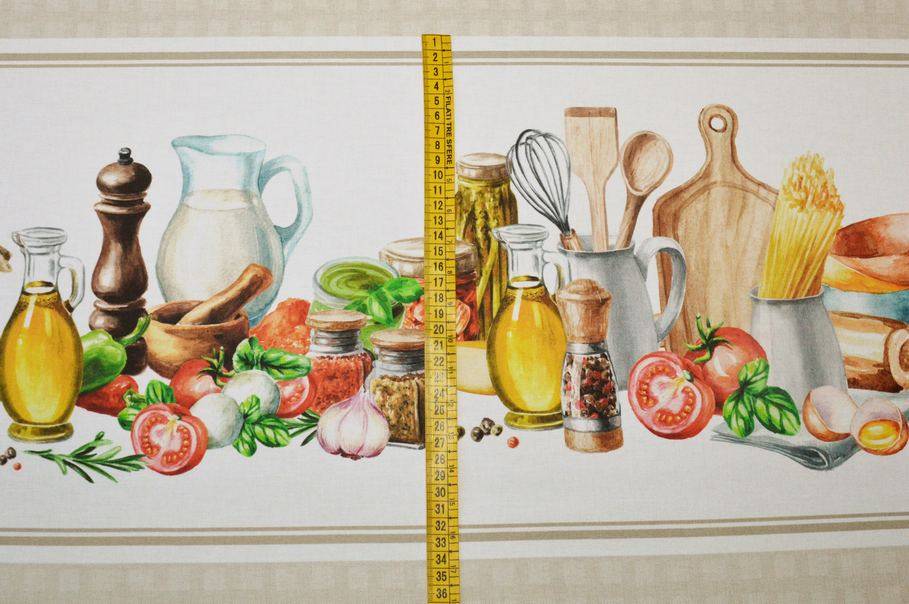 La banda centrale della tovaglia (larga 72 cm) si presenta beige e viene decorata da una piccola quadrettatura leggermente più scura composta da schacchetti di 1,3x1,5 cm ciascuno. Ai lati vi sono invece due fasce con stampa decorativa a tema cucina dove è possibile ammirare un armoniosa composizione colorata.