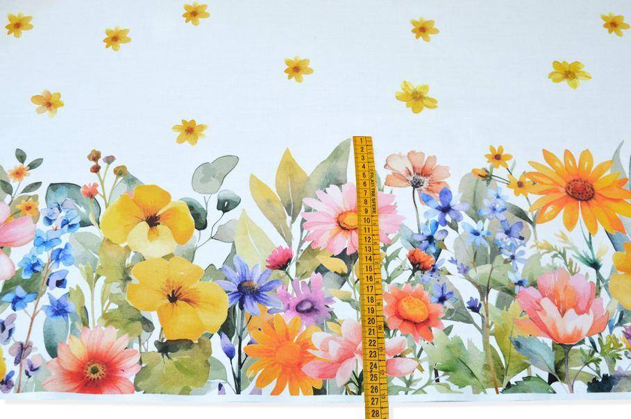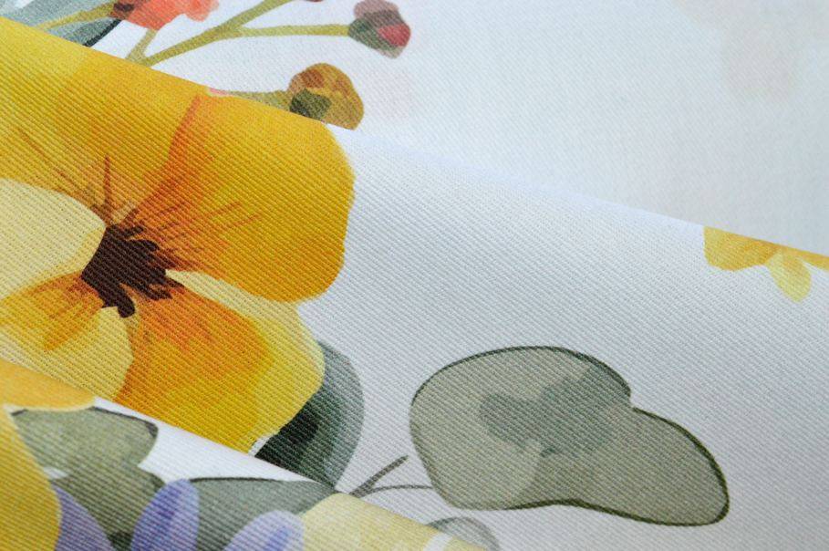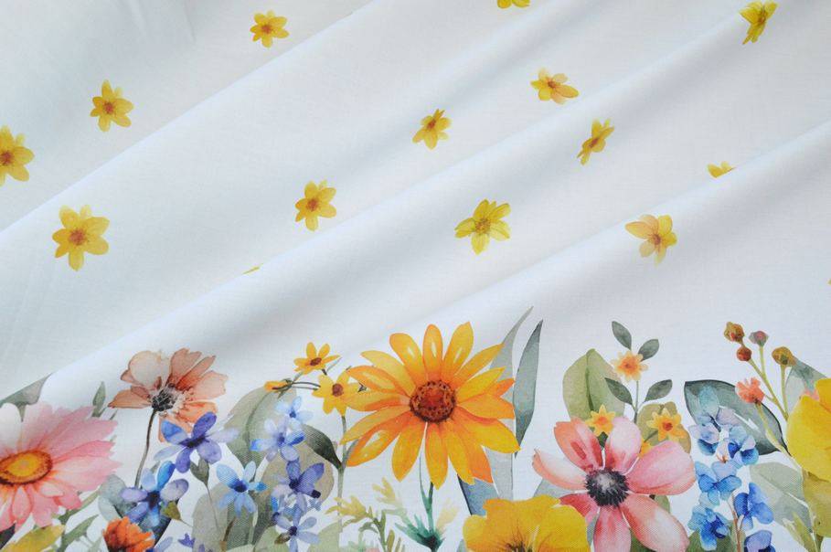 La banda centrale della tovaglia (larga 108 cm) mette a disposizione un candido fondo bianco il quale viene decorato da piccoli fiorellini gialli cosparsi su tutta la lunghezza. Ai lati viene invece incorniciata da due coloratissime fasce floreali alte 26 cm ciascuna.