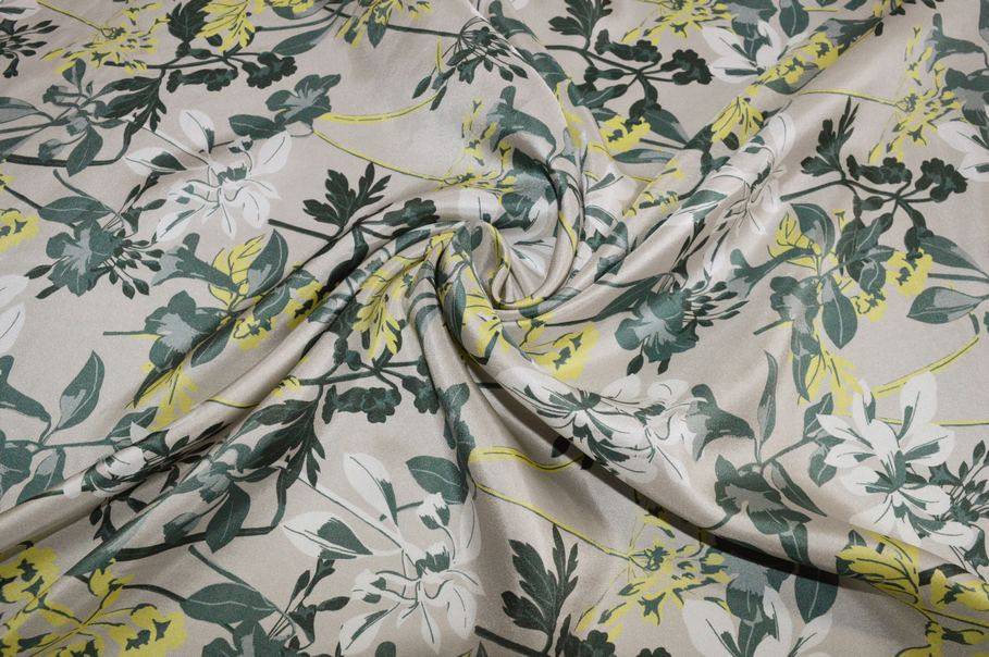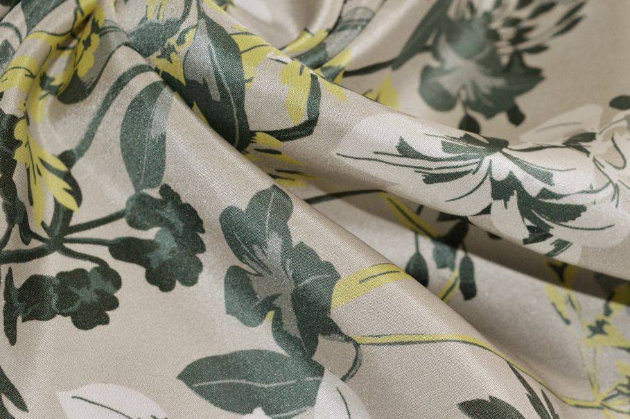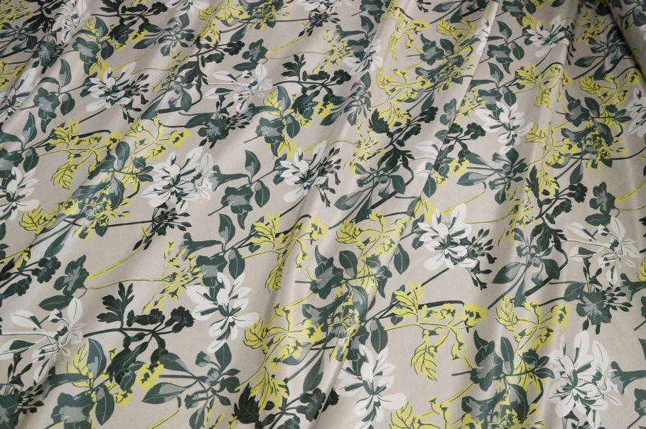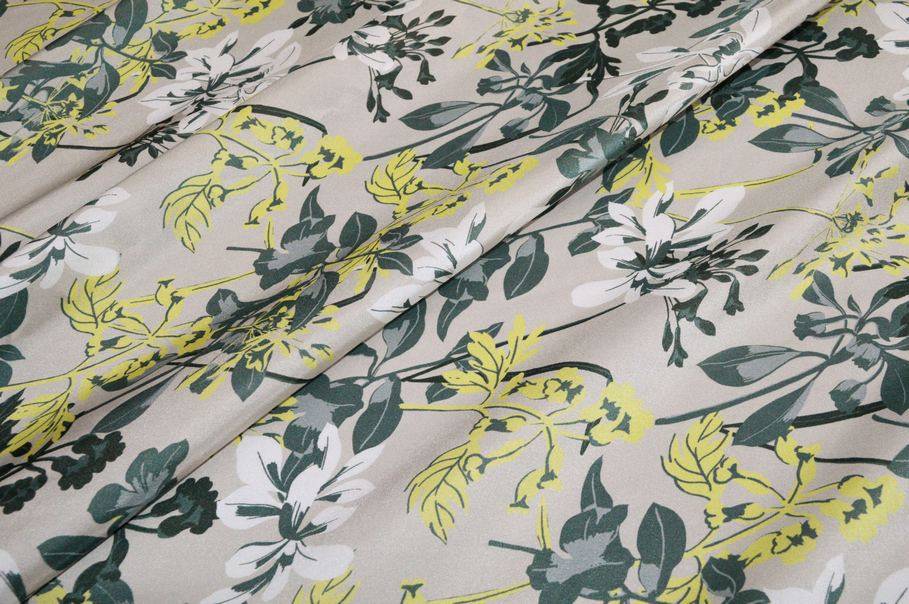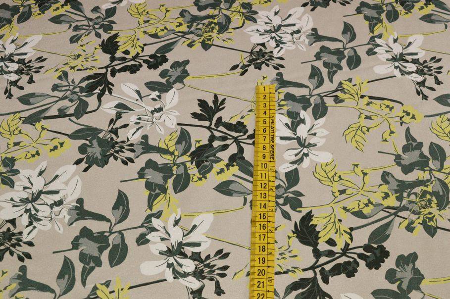 La fantasia è invece unica nel suo genere. Delicata ed originale presenta piccoli fiori gialli e color petrolio sovrapposti al fondo tinta unita tortora.