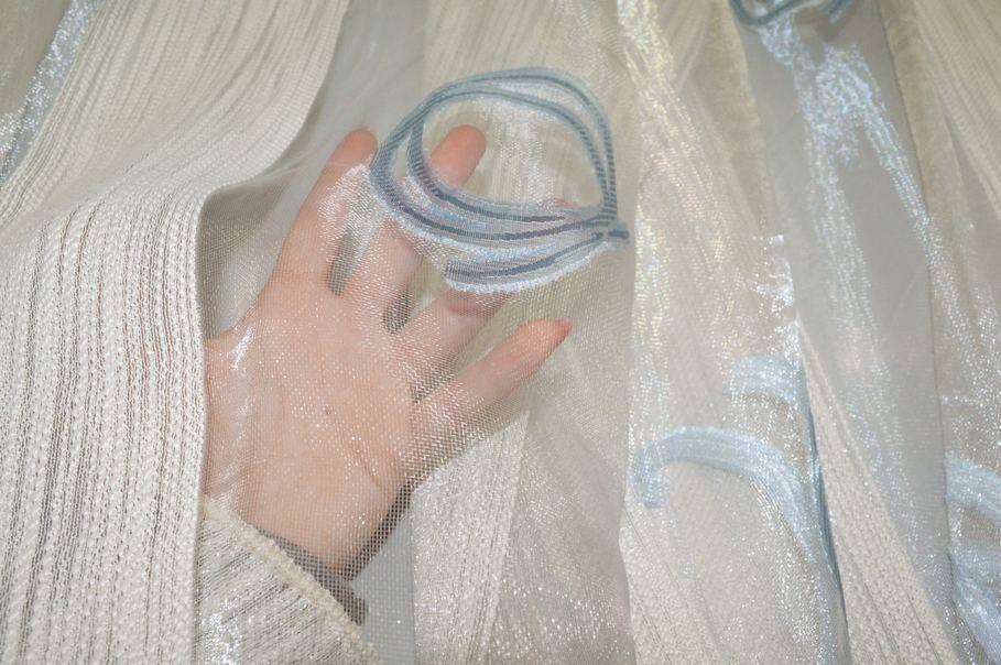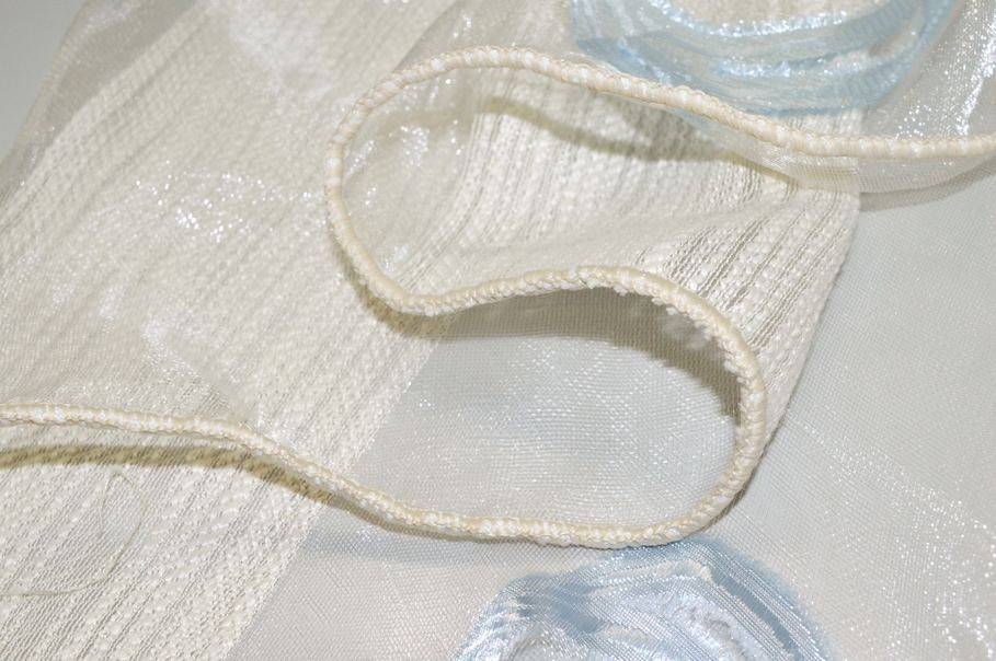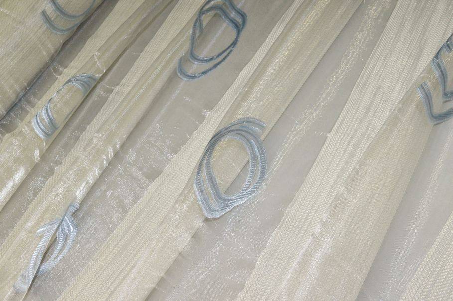 Il nostro tessuto in organza viene ideato e favorito nella confezione di tendaggi poiché grazie alla sua mano cadente, voluminosa, svolazzante e leggera permette di realizzare tende dalle linee morbide e dolci, ma anche con arricciature ricche e voluminose. Il fondo viene suddiviso in fasce verticali di differente coprenza le quali favoriscono l'illuminazione della stanza lasciando filtrare la luce, senza pero intaccare la privacy dell'ambiente. Le bande più coprenti presentano una trama evidente color panna, mentre quelle più velate vengono arricchite da applicazioni geometriche azzurre.