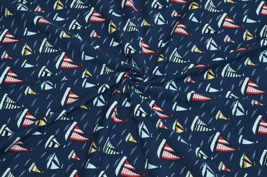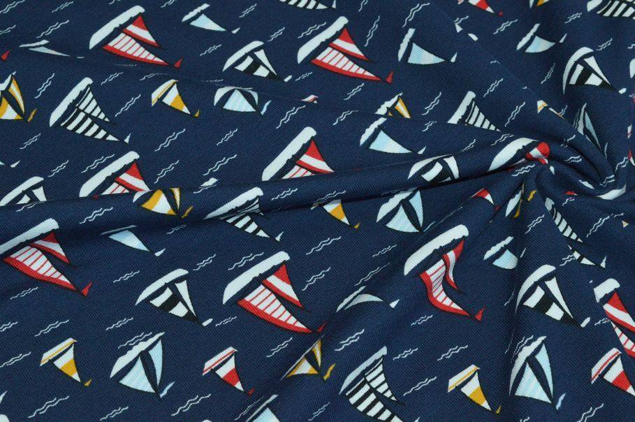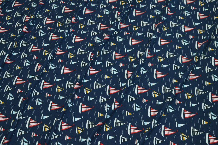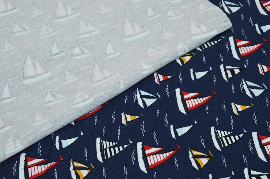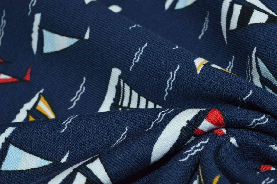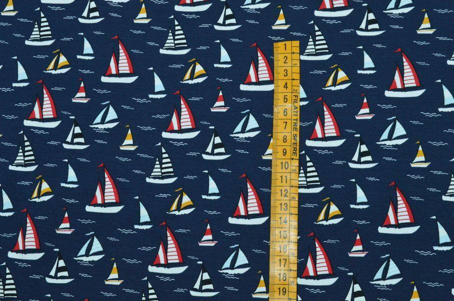 Il fondo presenta una giocosa fantasia a tema marino dove il fondo blu intenso viene colorato da piccole barchette rosse e gialle.
