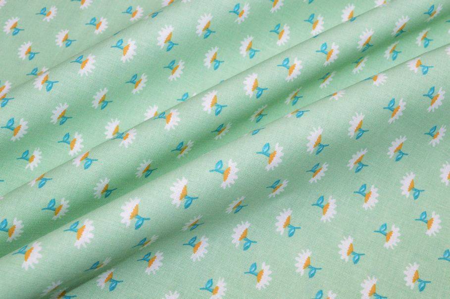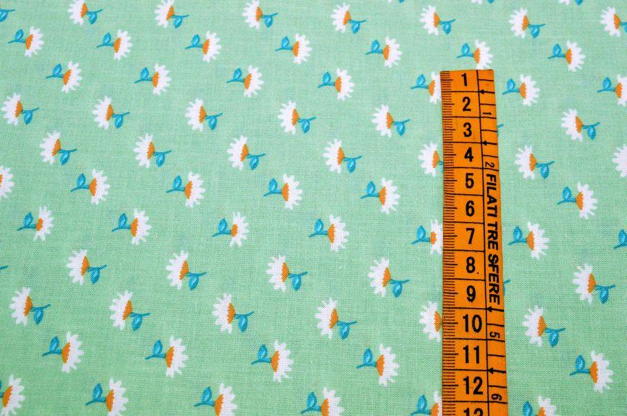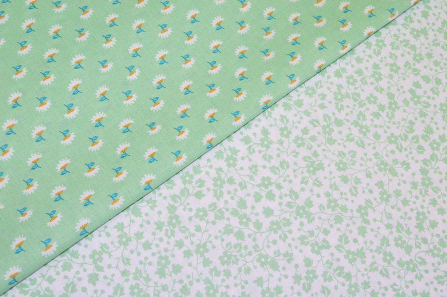 Tessuto di puro cotone con fantasie a tema primaverile abbinabili tra loro. Il primo disegno presenta un candido fondo bianco che mette in evidenza i delicati e minuti fiorellini color verde pastello che decorano la stoffa a campo pieno. La seconda fantasia invece inverte la posizione dei colori collocando il verde pastello sul fondo. Misura fiori 1x1 cm circa.
