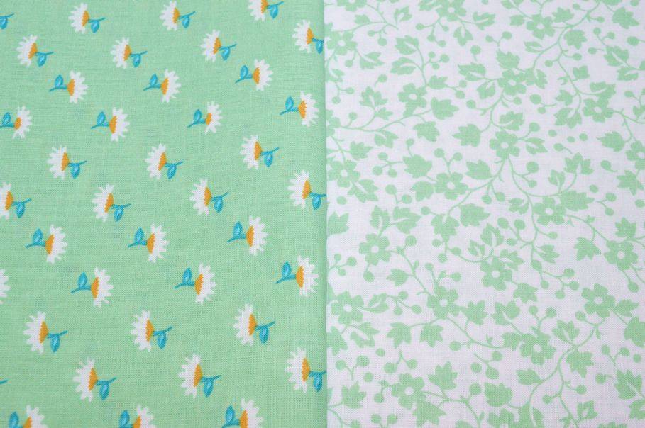 Tessuto di puro cotone con fantasie a tema primaverile abbinabili tra loro. Il primo disegno presenta un candido fondo bianco che mette in evidenza i delicati e minuti fiorellini color verde pastello che decorano la stoffa a campo pieno. La seconda fantasia invece inverte la posizione dei colori collocando il verde pastello sul fondo. Misura fiori 1x1 cm circa.