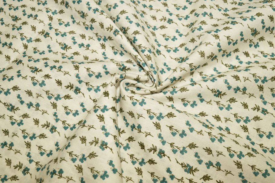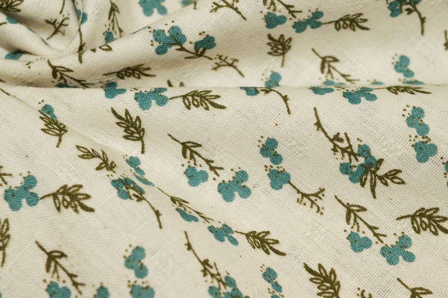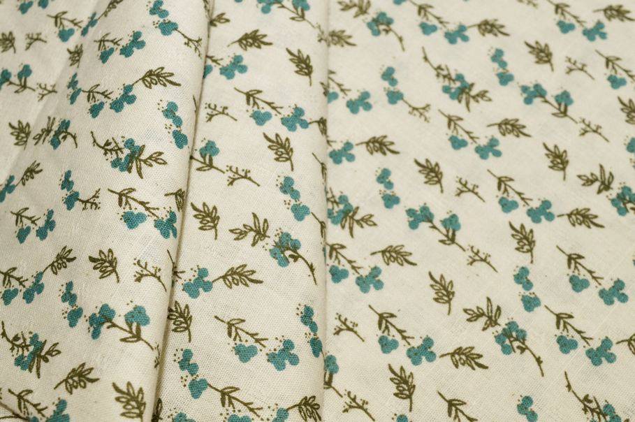 Presenta un fondo grezzo color panna e viene decorato a campo pieno dalla piccola fantasia fiorata azzurra.