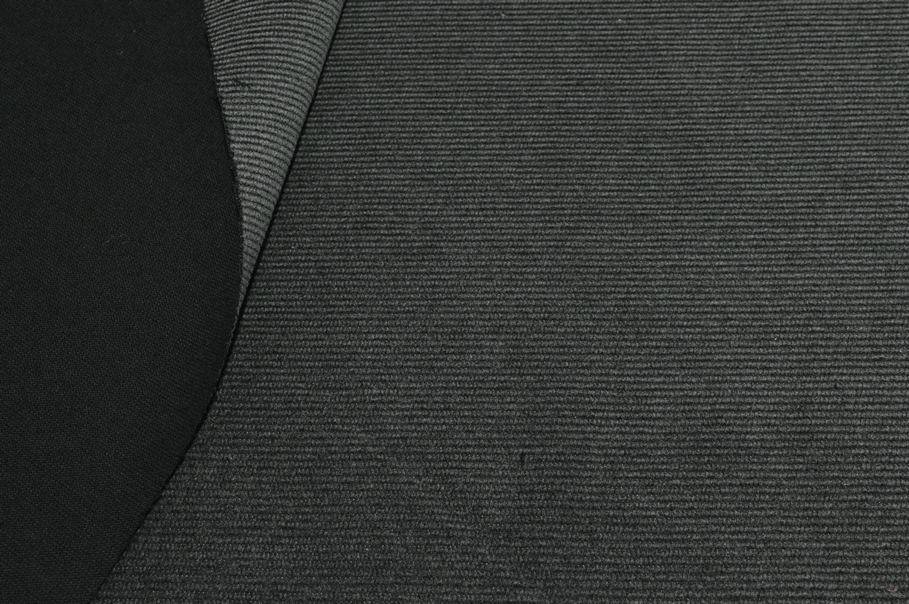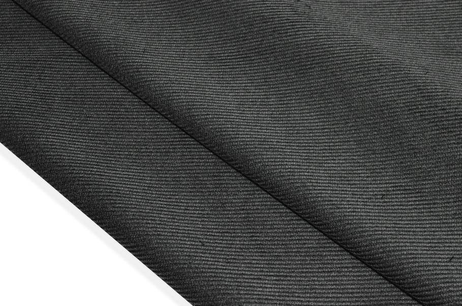 Il tessuto di velluto è un prodotto principalmente riconoscibile per il suo aspetto caratterizzato dalla superficie a coste composta da sottili righe di tessuto in rilievo. In questo caso la particolarità sta nella colorazione della stoffa poiché le coste sono grigie, mentre il fondo è nero. Questo lieve contrasto crea un grazioso e delicato effetto cangiante. Un'altra caratteristica nota è la mano molto morbida, tipica delle stoffe vellutate.