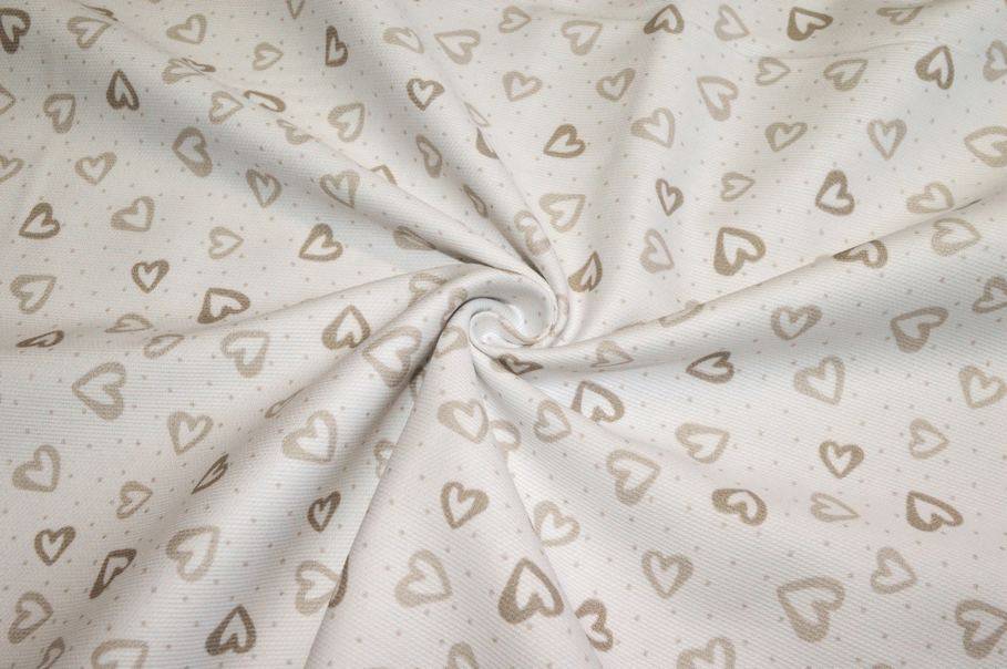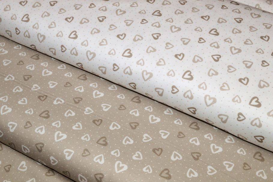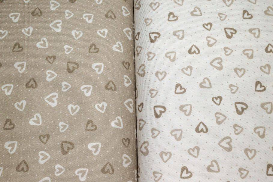 La prima variante del tessuto presenta un fondo bianco decorato da cuoricini beige a contrasto. La seconda fantasia invece ricrea lo stesso disegno ma con i colori invertiti dove il fondo è beige ed i cuori sono bianchi.