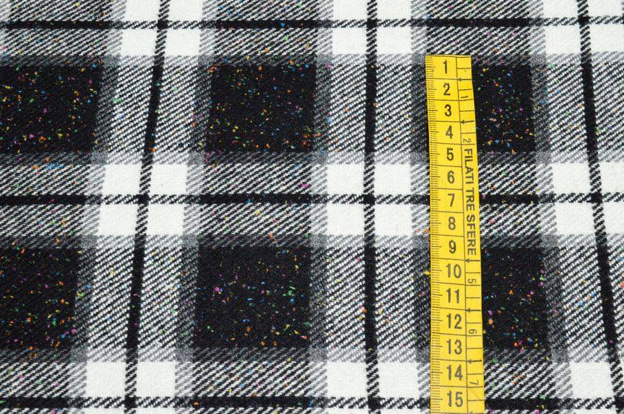 Composizione 60%poliestere 35%lana 5%seta, altezza cm 150, peso gr 360 al MT lineare. Misura scacco 4,1 x4,3 cm.