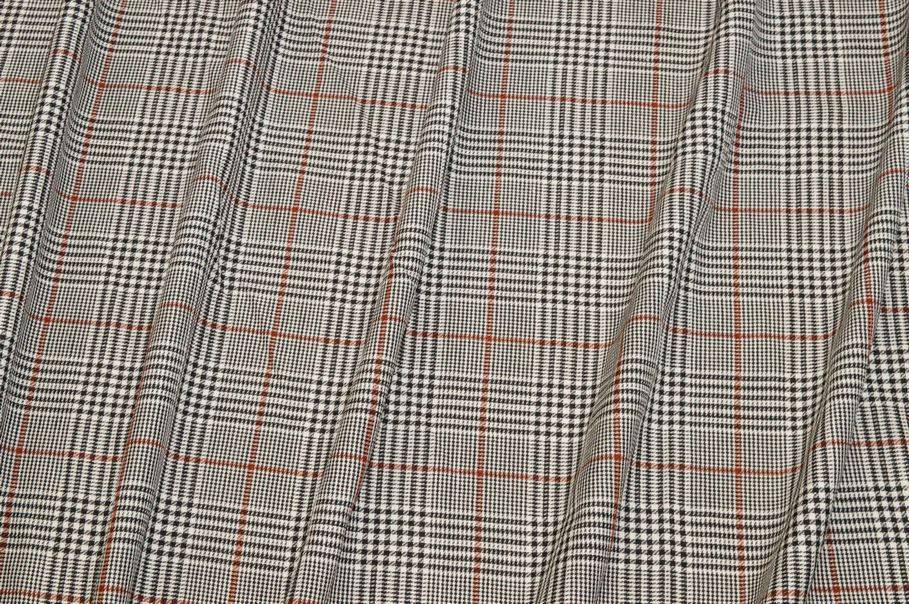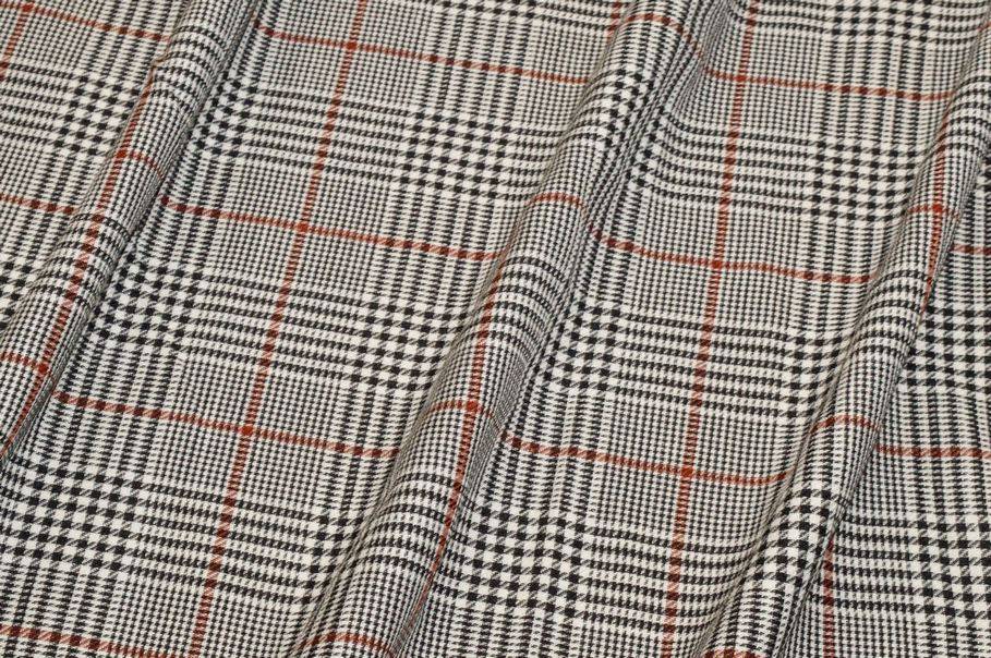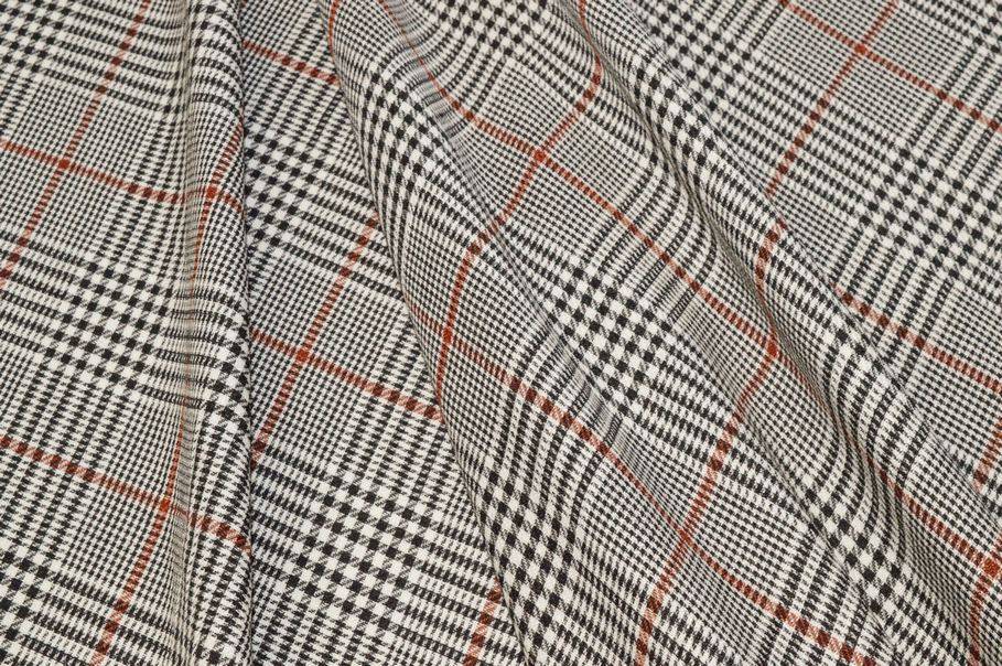 La scelta del design ricade su un elegante ed iconico principe di galles bianco e nero, arricchito dalla riga a contrasto color bruciato. Di grammatura media si presta perfettamente per la creazione di completi abito uomo, tailleur donna, gilet, giacche, pantaloni e gonne. Misura scacco bruciato 8,3x9,5 cm.