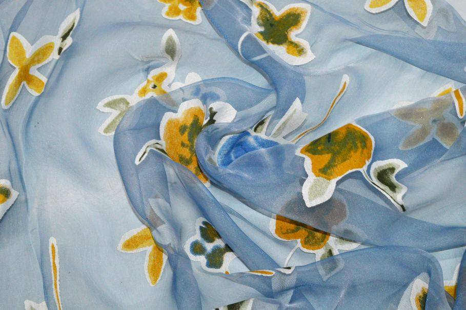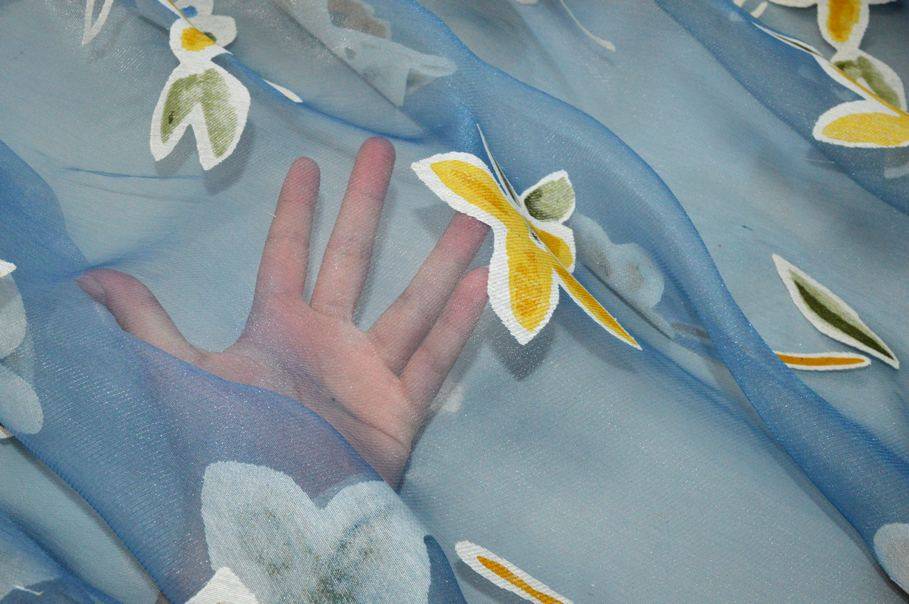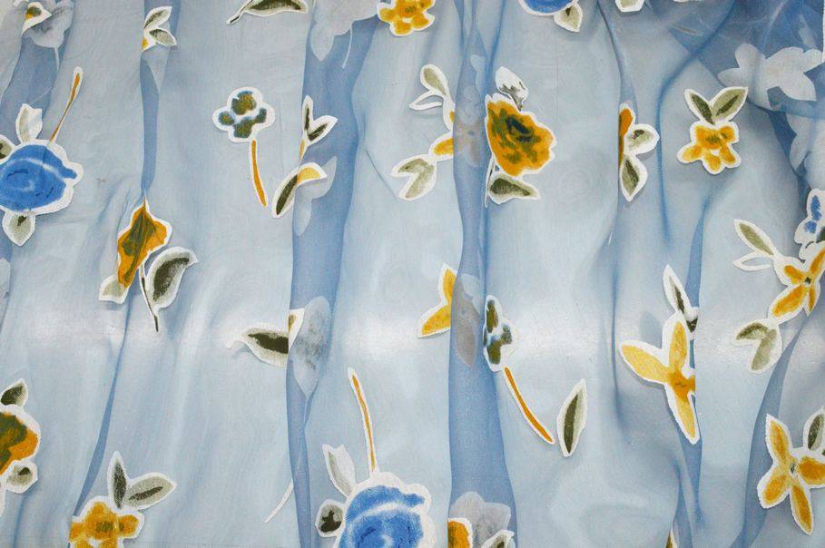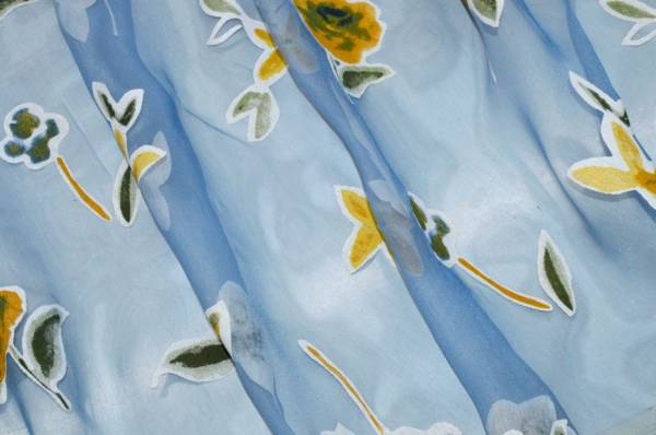 Splendido tessuto con leggero fondo in organza dall'aspetto cadente e molto trasparente. La base viene particolarizzata dalla delicata colorazione azzurra unita a dettagli coprenti floreali di differenti forme e gradazioni di giallo ed arancio. Ideale per realizzare tende doppie e/o arricciate di ogni tipologia.