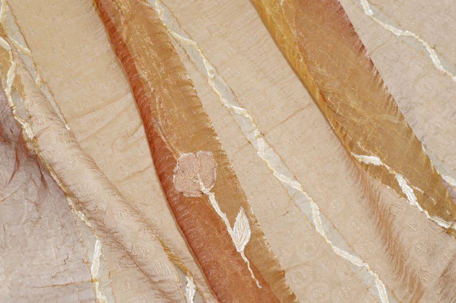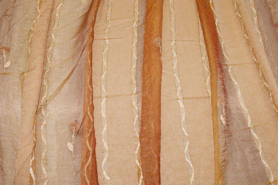 Un'altro pregio di questo prodotto è il design semplice, ma elegante che consiste in un fondo di organza stropicciata a fasce beige e color rame arricchite da ricami floreali in fill coupe. Indicato per realizzare tende arricciate per saloni e camere da letto dallo stile classico.