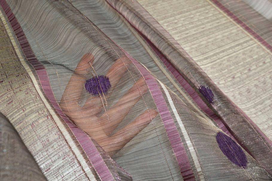 Tessuto in organza ideato per la confezione di tendaggi. Questo prodotto si contraddistingue per la sua particolare struttura composta da alcune fasce realizzate con una doppia organza che al suo interno racchiude sottili filati orizzontali che danno vita ad un design unico nel suo genere. A creare movimento troviamo inoltre particolari bolli ricamati viola in ciniglia.