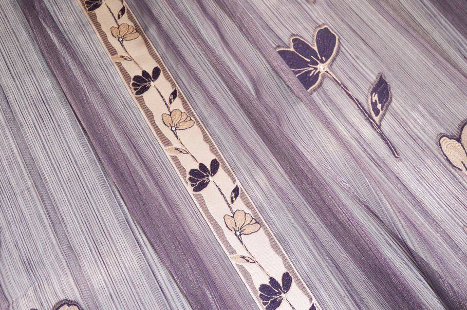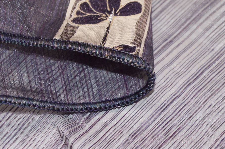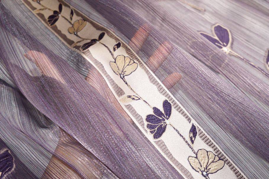 Il fondo viene realizzato con della bellissima organza viola decorata da fasce coprenti. Le fasce mettono in mostra un raffinatissimo ricamo beige e viola a tema floreale. Preziosa ed elaborata, ma allo stesso tempo classica ed elegante rappresenta un vero e proprio elemento d'arredo altamente lussuoso. Realizzato con base in organza presenta una mano molto leggera e trasparente. La leggerezza del prodotto lo rende un articolo perfetto per arredare ambienti con poca illuminazione.