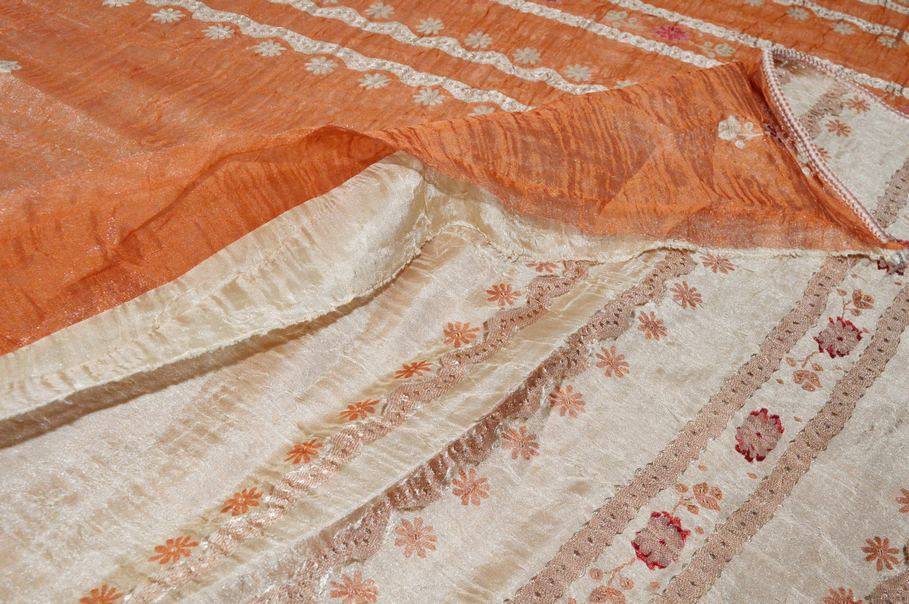La particolarità di questo tessuto per tende sta nella sua struttura ottenuta dall'unione di due strati di stoffa. Il primo livello viene realizzato in leggera organza dall'aspetto luminoso e trasparente. Presenta una bellissima colorazione arancione impreziosita da piccoli fiorellini rossi. Il secondo strato ha sempre una mano molto morbida e cadente, ma coprente. Ha una delicata colorazione beige abbastanza luminosa ed unito all'organza arancione crea raffinati ricami floreali.
