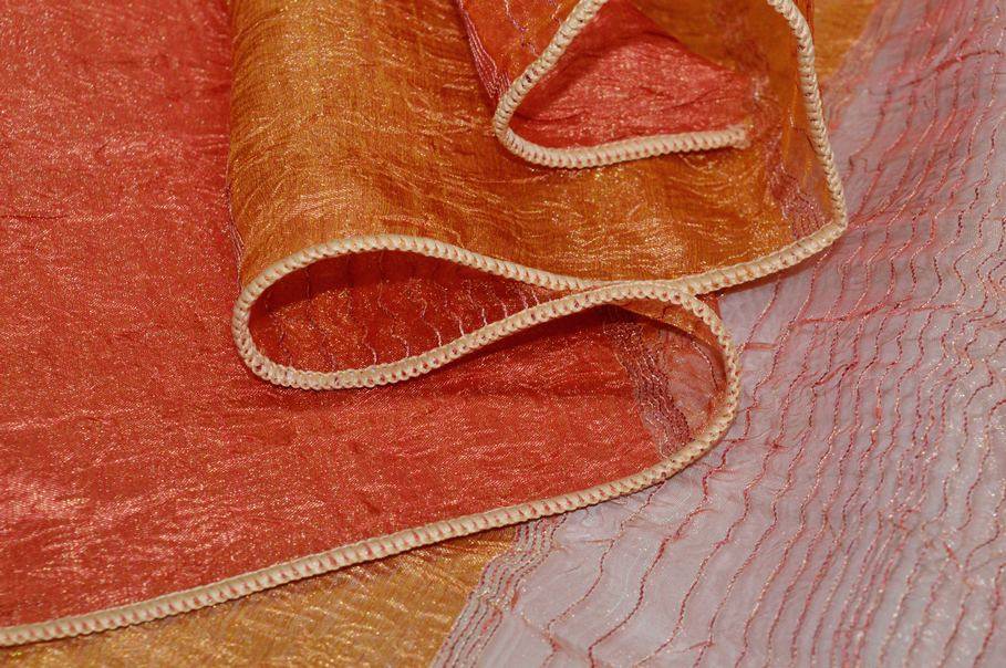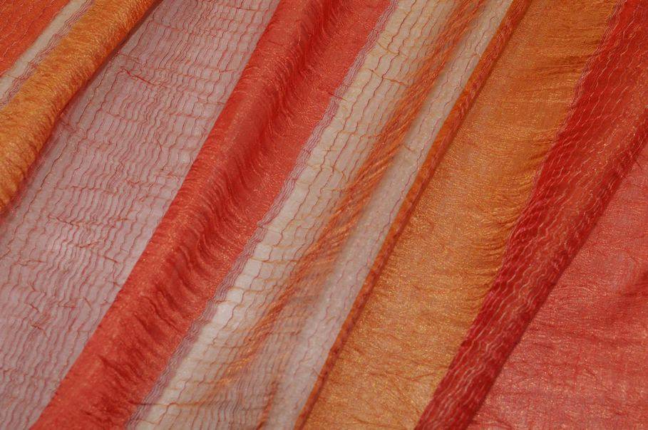 Tessuto per tende realizzato su base in organza suddivisa in fasce più e meno coprenti color giallo/oro ed arancio molto intenso (quasi rossiccio).