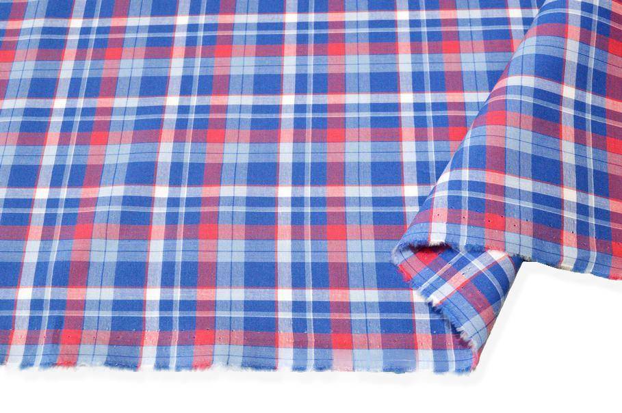 Tessuto di puro cotone ottimo da indossare nelle stagioni primavera/estate. Questo prodotto viene ottenuto dalla lavorazione di filati totalmente naturali di puro cotone i quali conferiscono alla stoffa una mano molto leggera, liscia, traspirante e fresca. Nonostante la sua leggerezza riese a garantire un fondo coprente che sfoggia la giocosa fantasia a scacchi rossi e blu. Indicato per confezionare indumenti sia maschili che femminili come comode camicette, abitini corti e lunghi e scamiciate.