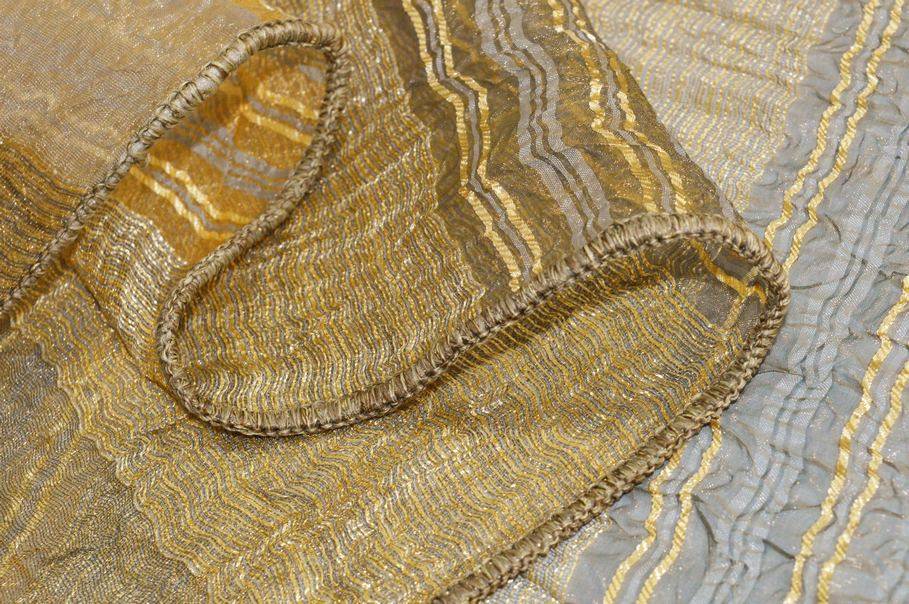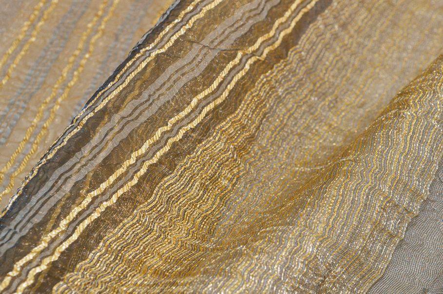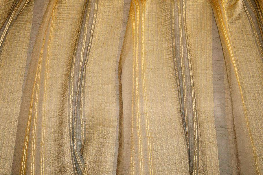 Un'altro pregio di questo prodotto è il design molto particolare. Il fondo viene suddiviso in sottili righe irregolari oro e blu che creano una bellissima sfumatura. Ad impreziosire ancora di più la stoffa è l'aspetto luminoso che, a seconda delle luce, crea splendidi riflessi. Indicato per realizzare tende arricciate per saloni e camere da letto dallo stile classico.
