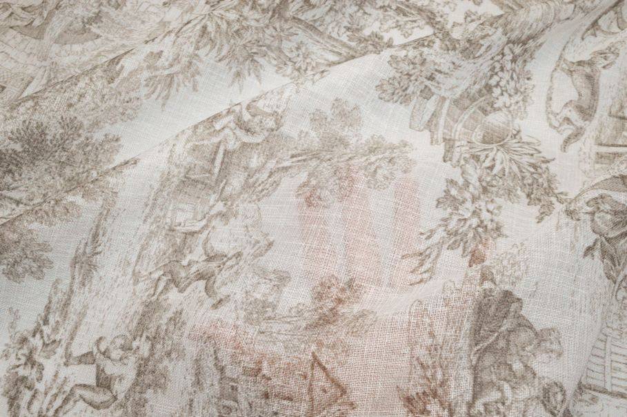 La fantasia toile de jouy sfoggia l'inconfondibile paesaggio pastorale nella variante colore beige. Indicato per tendini a vetro per sala, veranda e cucina.