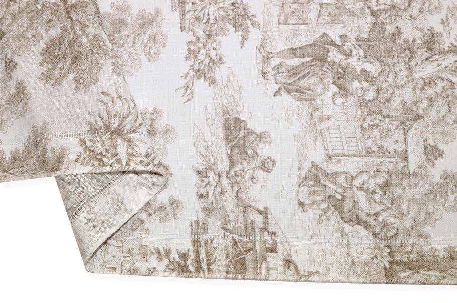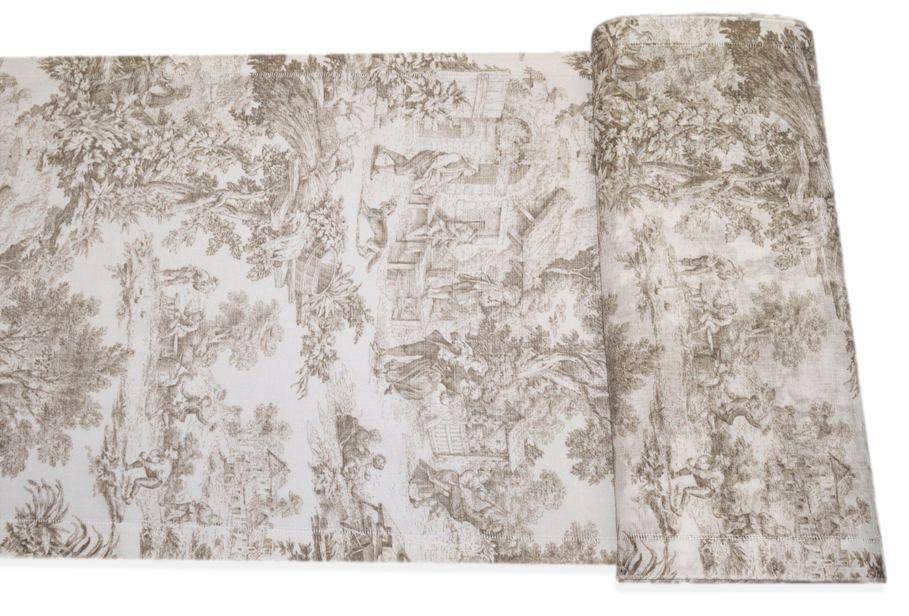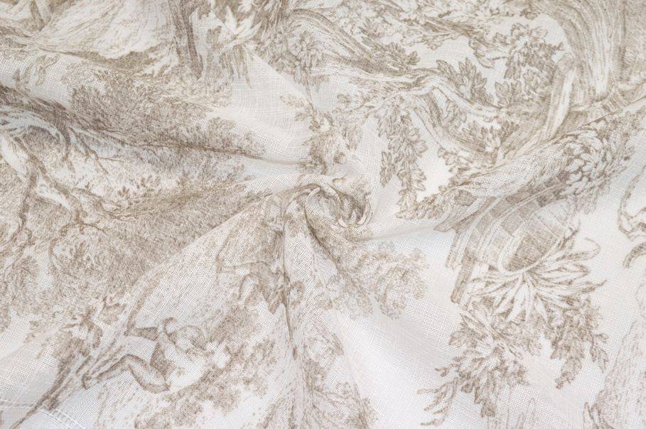 La fantasia toile de jouy sfoggia l'inconfondibile paesaggio pastorale nella variante colore beige. Indicato per tendini a vetro per sala, veranda e cucina.
