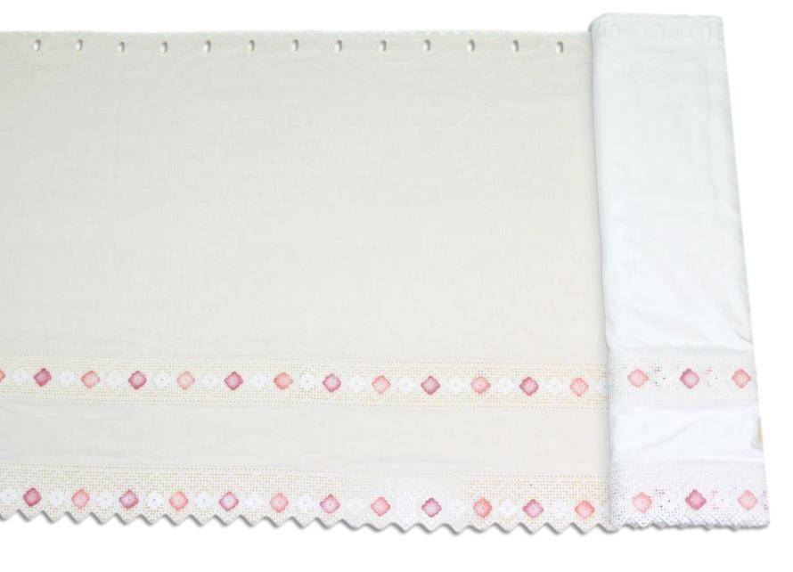 Tendino a vetro di colore bianco naturale decorato da graziosi incassi in pizzo con fiori rosa fragola e malva. La base presenta una leggera trama misto lino dalla mano leggera, semicoprente e filtrante alla luce. Nella zona superiore della tenda ci sono degli occhielli dove si inseriscono le apposite astine per tendini a vetro (sia a molla che con ganci). Smerlato sul fondo. Necessita di cucitura soltanto ai lati dove viene effettuato il taglio.