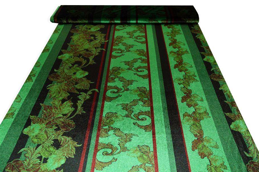Il fondo sfoggia un particolarissimo design ottenuto dalle linee orizzontali verdi abbinate a ghirigori giallo/oro a contrasto. Indicato per capi d'abbigliamento sia casual che eleganti come maglie, gonne lunghe ed abiti.