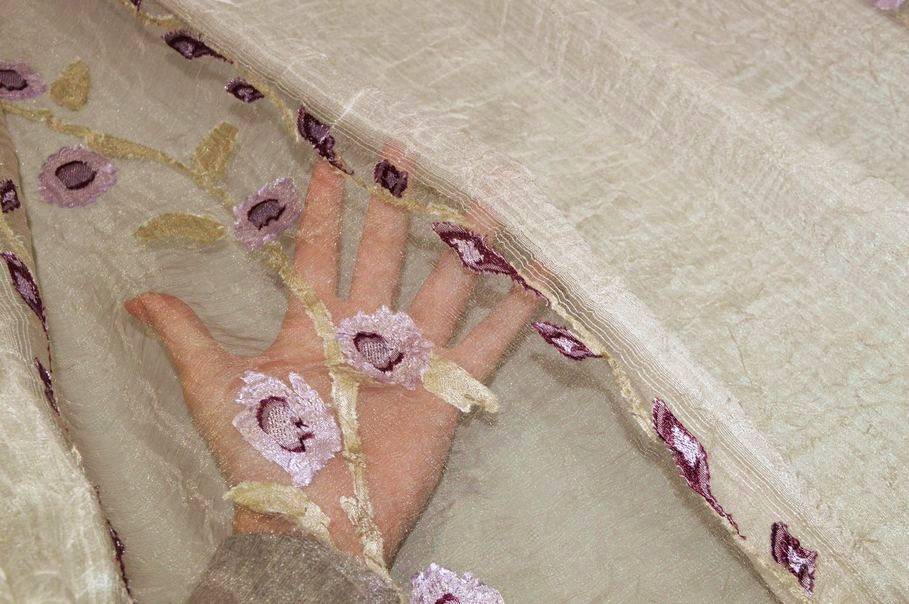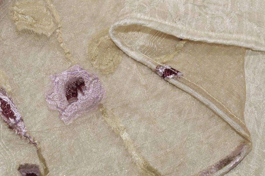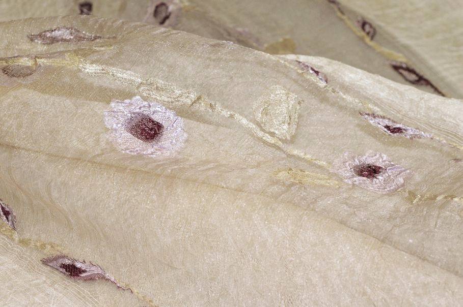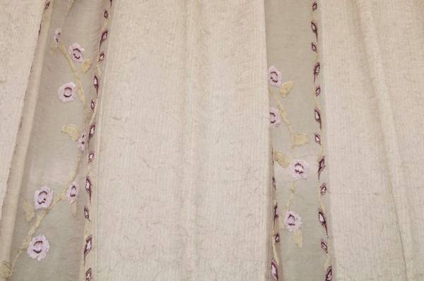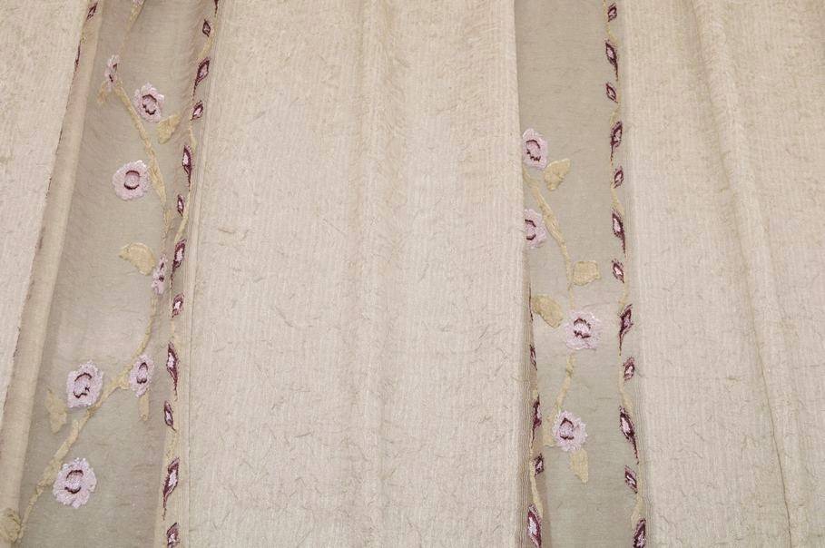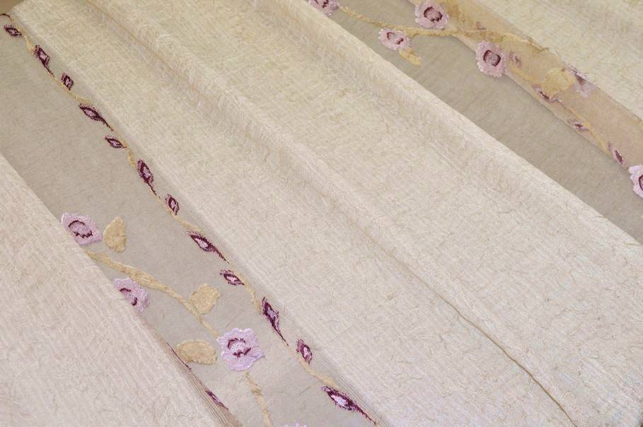 TESSUTO TENDA STROPICCIATA BEIGE CON FIORI LILLA RICAMATI