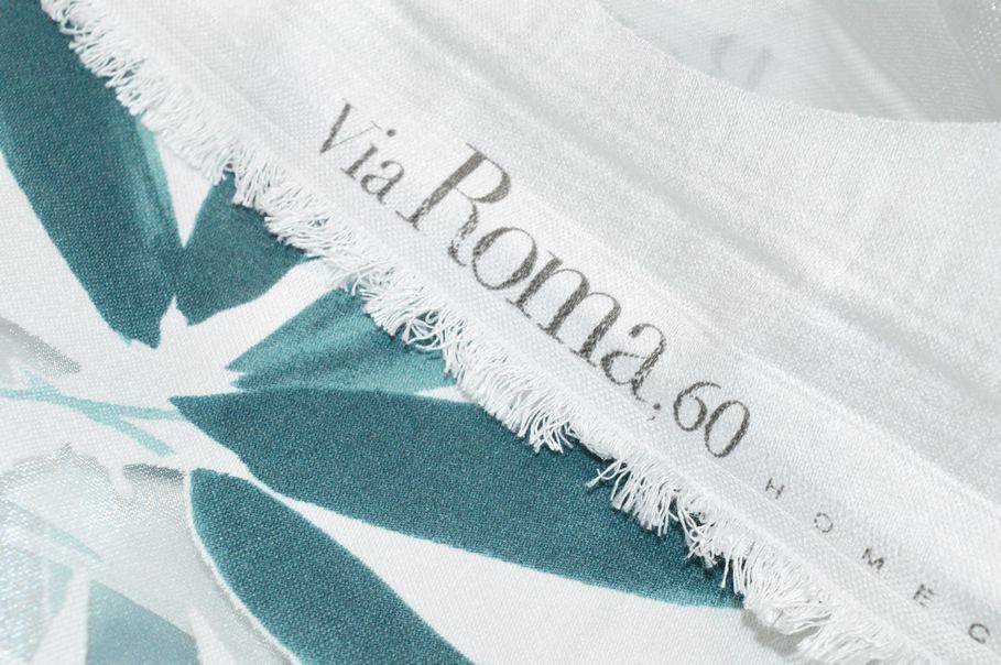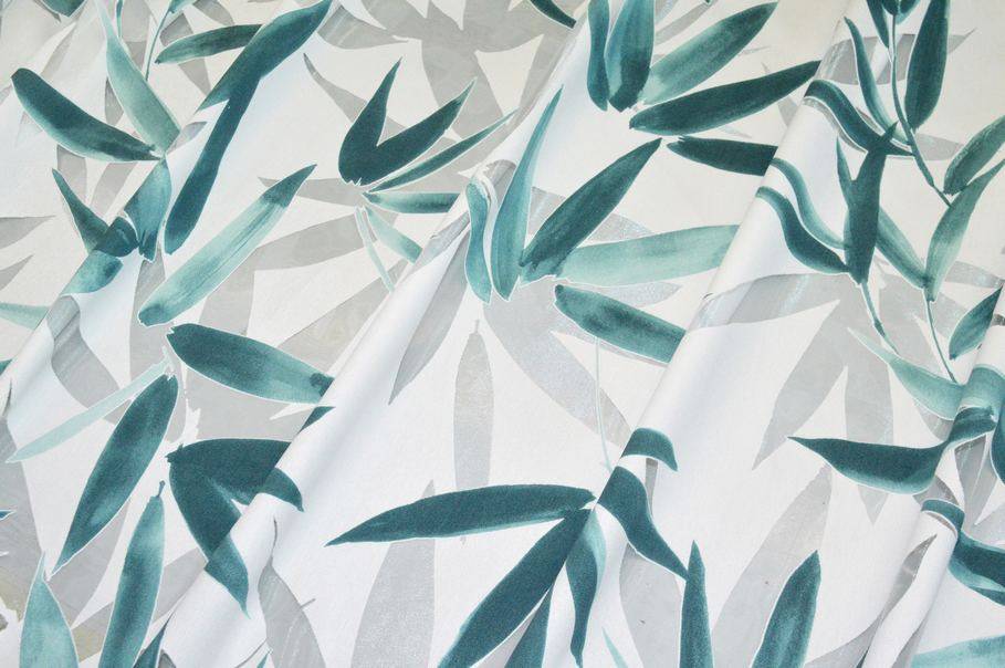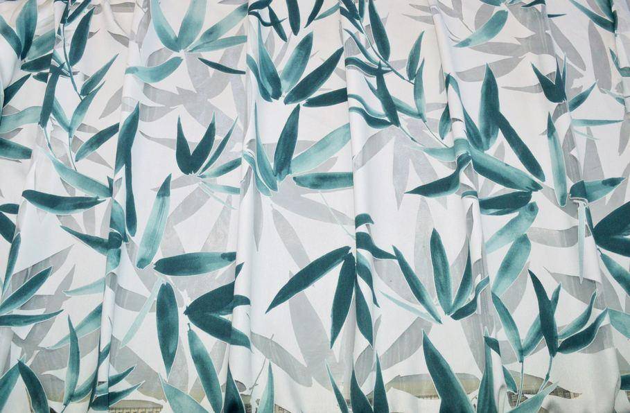 Le foglie vengono colorate dalla bellissima tonalità petrolio che completa l'elegante disegno. Un'altra particolarità di questa lavorazione è l'effetto sfumato. Infatti la fantasia inizia dalla cimosa superiore dove le foglie sono più fitte e si estende diminuendo di intensità fino ad 80 cm dal fondo ricreando l'effetto di una pianta pendente. Indicato principalmente per realizzare tende arricciate di ogni tipologia. Piombato sul fondo.