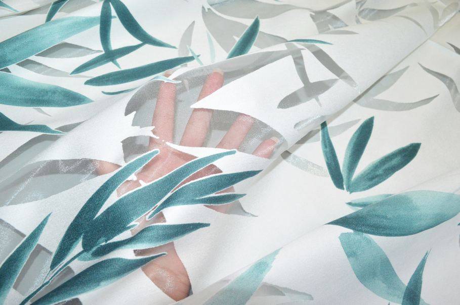 Il fondo si presenta semplice ed offre una base tinta unita bianca che mette in risalto la bellissima fantasia devoreh. Il disegno raffigura foglie stilizzate con dettagli trasparenti e coprenti per un effetto vedo non vedo, tipico delle stoffe in devoreh. Questa lavorazione consente alla luce naturale di filtrare facilmente illuminando gli spazi con scarsa luminosità, mantenendo però un adeguato livello di privacy nell'ambiente che si vuole arredare.