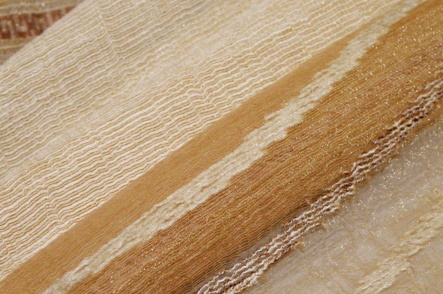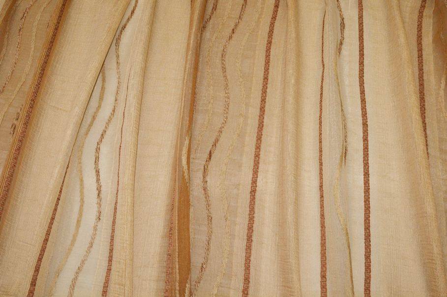 Un'altro pregio di questo prodotto è il design semplice, ma originale che consiste in un fondo di organza suddiviso in fasce irregolari di differente coprenza, colore e larghezza. Questa caratteristica dona movimento al fondo della stoffa dando vita ad un pezzo d'arredamento unico nel suo genere. Molto bella è anche la scelta dei colori che unisce armoniosamente numerose gradazioni di beige/dorato e marrone. Indicato per realizzare tende arricciate per saloni e camere da letto dallo stile classico.