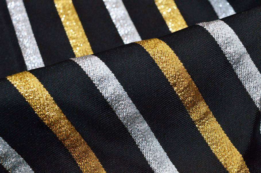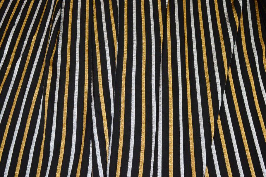 Particolare tessuto in misto viscosa dalla mano morbida, cadente e leggera. Nonostante la sua leggerezza mette ugualmente a disposizione un aspetto abbastanza coprente. La colorazione scelta per il fondo è un classico nero che mette perfettamente in risalto la lavorazione a righe oro ed argento. Le righe sono lurex/metallico pertanto hanno un aspetto brillante che aggiunge luccichio e pregio al prodotto. Indicato per realizzare camicette, casacche, top ed abiti vari.