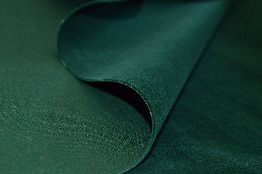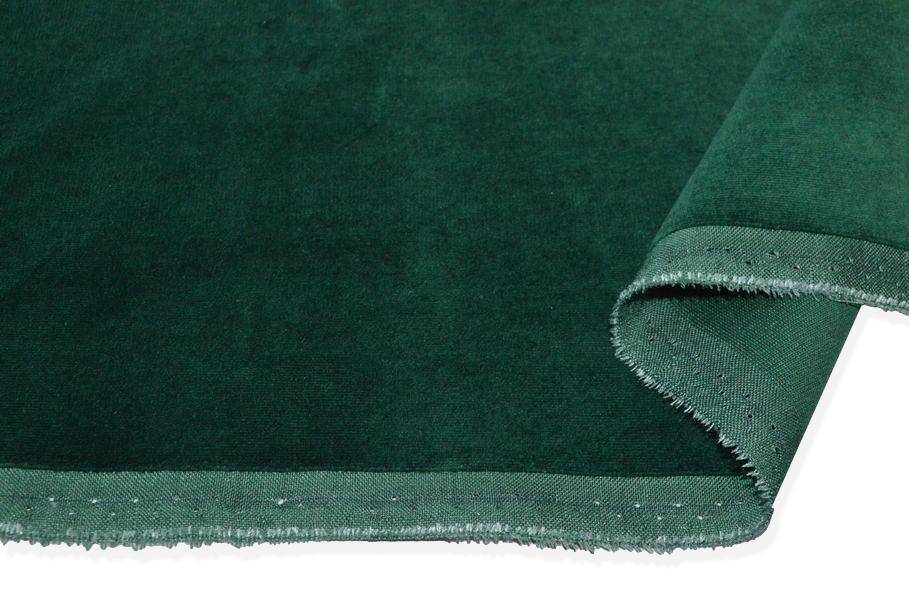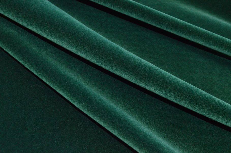 Ottimo velluto liscio di puro cotone dall'aspetto elegante e lussuoso noto per la sua tipica superficie morbida e setosa. La particolarità di questo materiale sta nell'avere un aspetto luminoso che cattura la luce in modo delicato donando alla stoffa un aspetto raffinato e di grande classe. La mano si presenta strutturata e sostenuta al tatto. La colorazione scelta per il fondo è un bellissimo verdone, una tonalità intensa di verde scuro che dona al velluto maggiore bellezza e pregio.
