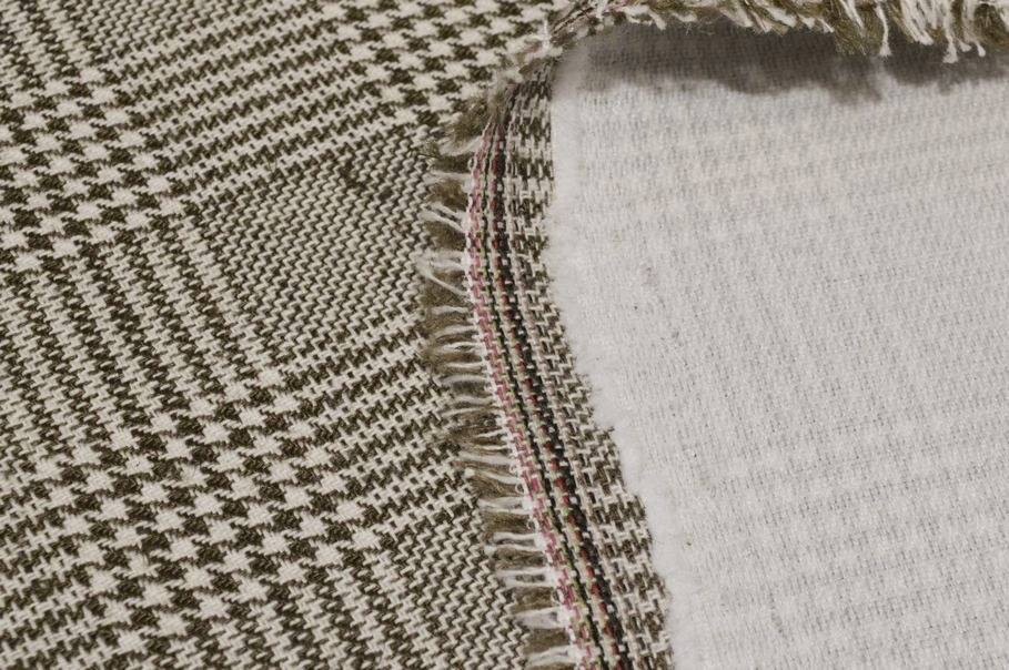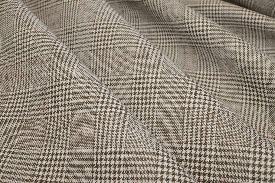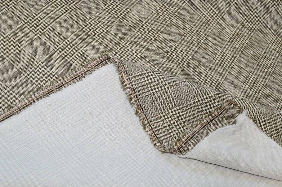 Tessuto ottenuto dalla lavorazione di filati di puro lino mescolati con un 20%di viscosa i quali mettono a disposizione un prodotto totalmente naturale. Questo lino presenta una trama fitta, ma riesce ugualmente a garantire un'ottima traspirabilità durante l'indosso rendendolo confortevole ed agevole. Sul rovescio è già applicata la telina termoadesiva che aggiunge corposità e struttura alla stoffa. Il fondo presenta l'iconico motivo principe di galles beige il quale conferisce al tessuto un aspetto classico ma sempre attuale e di classe, che si adatta perfettamente anche alle ultime tendenze. La sua consistenza e grammatura pesante ne finalizzano l'uso prevalentemente per capispalla uomo/donna come giacche, tailleur e gonne.
