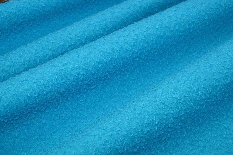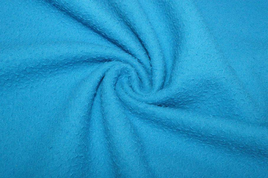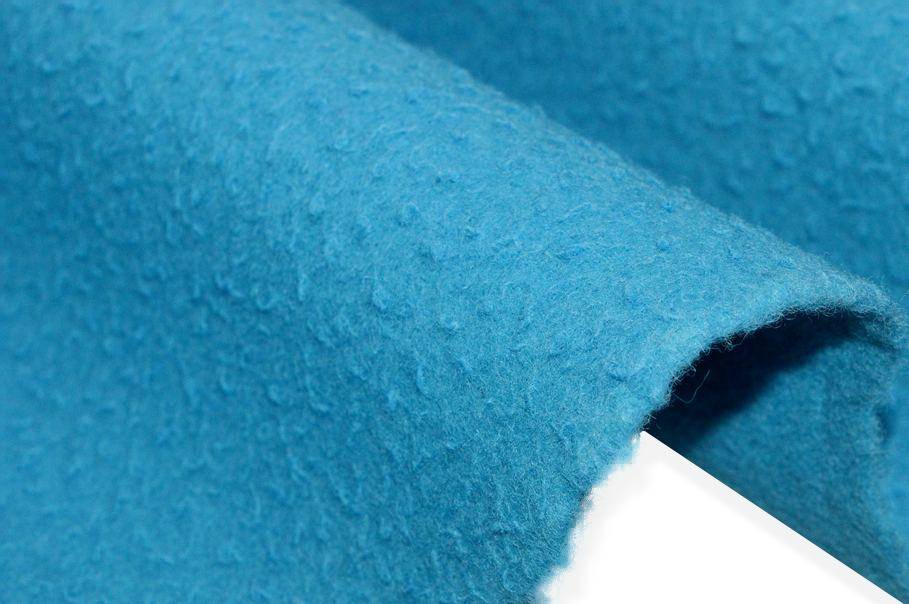 La colorazione scelta per il fondo è una particolare, vivace ed accattivante nuance di azzurro che donerà al capo realizzato con questa stoffa un design unico nel suo genere. La sua caratteristica principale che lo distingue dagli altri prodotti in lana è la tipica superficie irregolare dall'effetto infeltrito ottenuto volontariamente dalla follatura della stoffa.