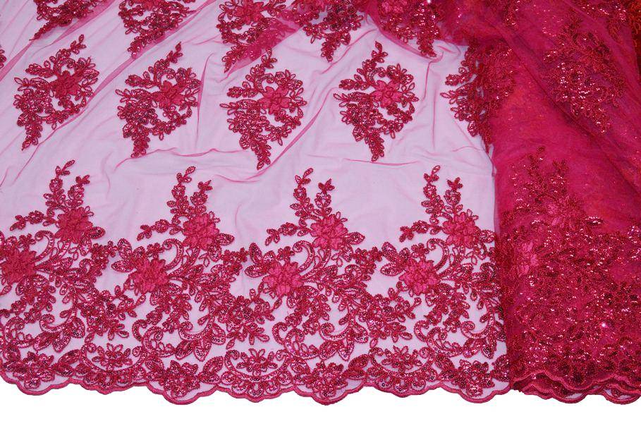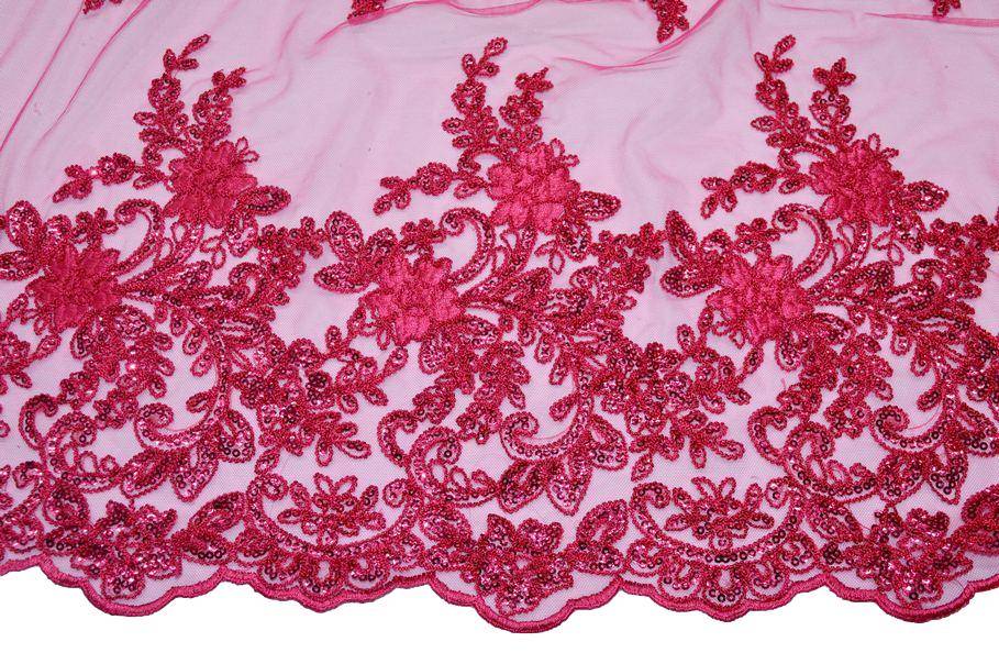 Questo tessuto tulle ricamato è una scelta elegante e sofisticata, ideale per abiti da sposa, da cerimonia e per eventi formali. La sua base in tulle trasparente è impreziosita da un ricamo floreale in rilievo che dona al tessuto un aspetto di classe, mentre le cimose smerlate su entrambi i lati aggiungono un tocco ulteriore di raffinatezza. La sua morbidezza e la caduta fluida lo rendono perfetto per creare abiti che avvolgono il corpo con grazia, ed è l'ideale anche per realizzare capi con dettagli vedo/non vedo, grazie alla trasparenza delicata. Inoltre, il tessuto è arricchito da paillettes cucite con cura, che aggiungono un raffinato brillio rendendo ogni creazione ancora più preziosa ed elegante.