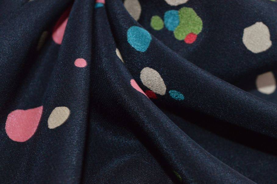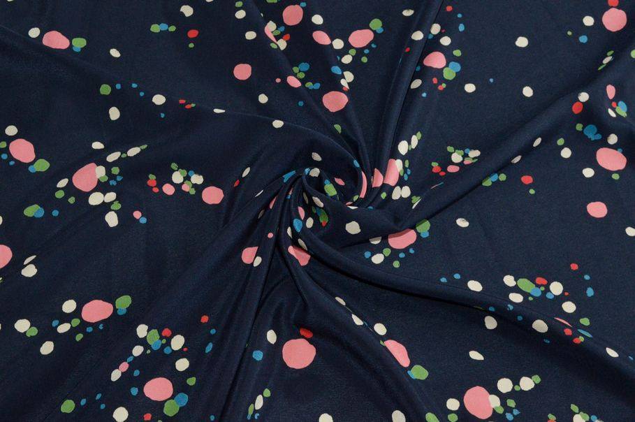 Tessuto crepe de chine realizzato in pura seta, una fibra completamente naturale che conferisce al materiale una mano morbida, leggera e fresca, garantendo traspirabilità e comfort. Una volta indossato, il tessuto si distingue per la sua caduta fluida e svolazzante, rendendolo ideale per capi primaverili ed estivi. Il design presenta un elegante fondo blu notte impreziosito da punti di colore che ricordano schizzi di vernice, dando al tessuto un tocco giovanile e vivace.