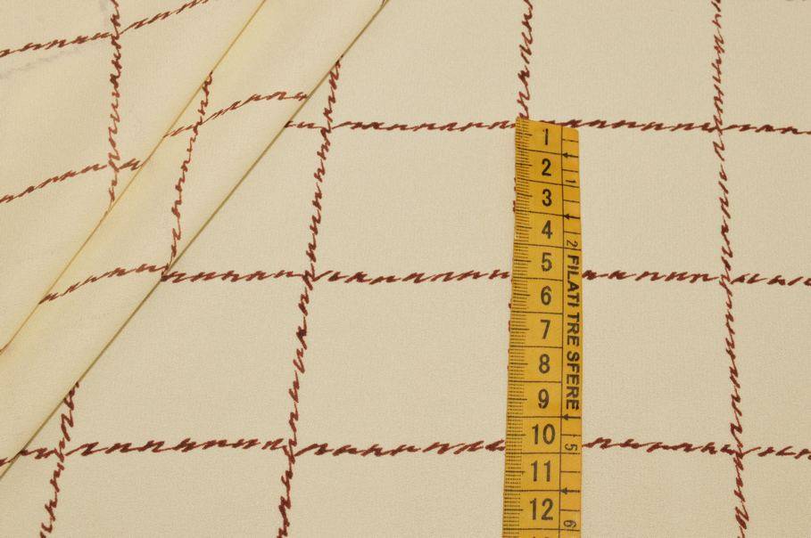 La tonalità di fondo, un giallo paglierino/crema, è arricchita da un elegante disegno finestrato a quadri bordeaux, caratterizzato da una linea irregolare che conferisce un effetto molto particolare al tratto della linea, come se fosse tracciata a mano. Ideale per abiti corti e lunghi, gonne morbide o con volant, camicette, top e foulard eleganti.
