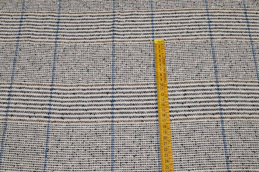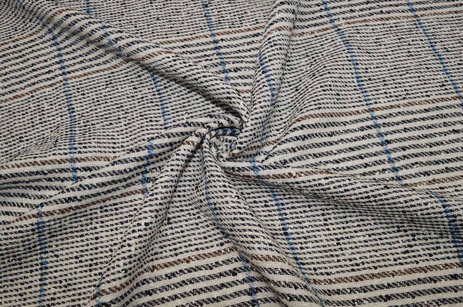 Questo tessuto unisce diversi filati naturali come cotone, lino e viscosa, offrendo un materiale fresco, traspirante e perfetto per i capi primaverili ed estivi. La sua superficie presenta un effetto bouclé caratterizzato da piccoli nodini in rilievo che decorano la superficie. Il fondo chiaro viene inoltre arricchito da righe marroni e blu che formano una fantasia a quadri larghi. Questo tessuto è ideale per giacche corte, tailleur, gonne e abitini, ma non è adatto per la creazione di pantaloni.