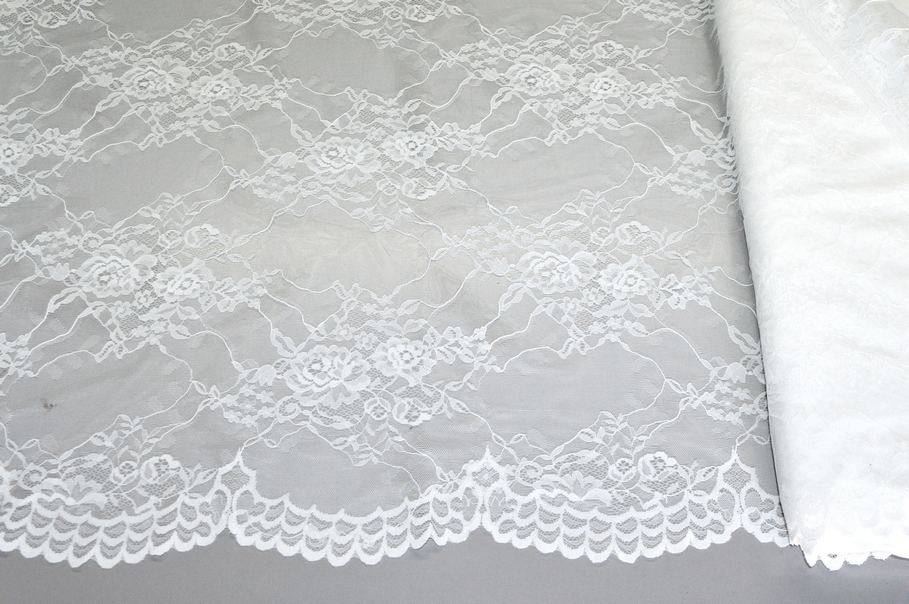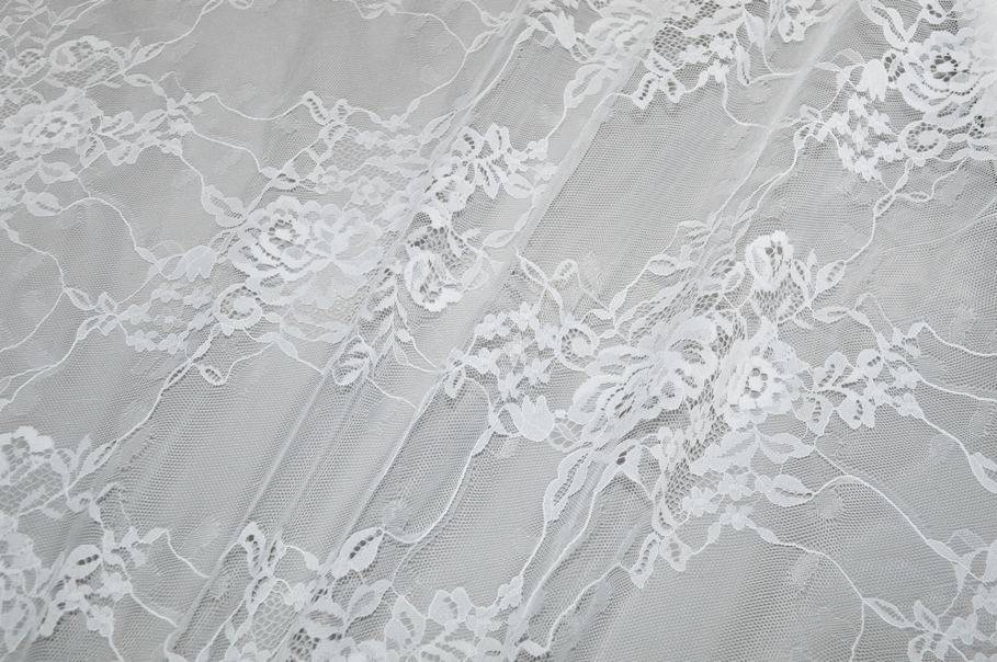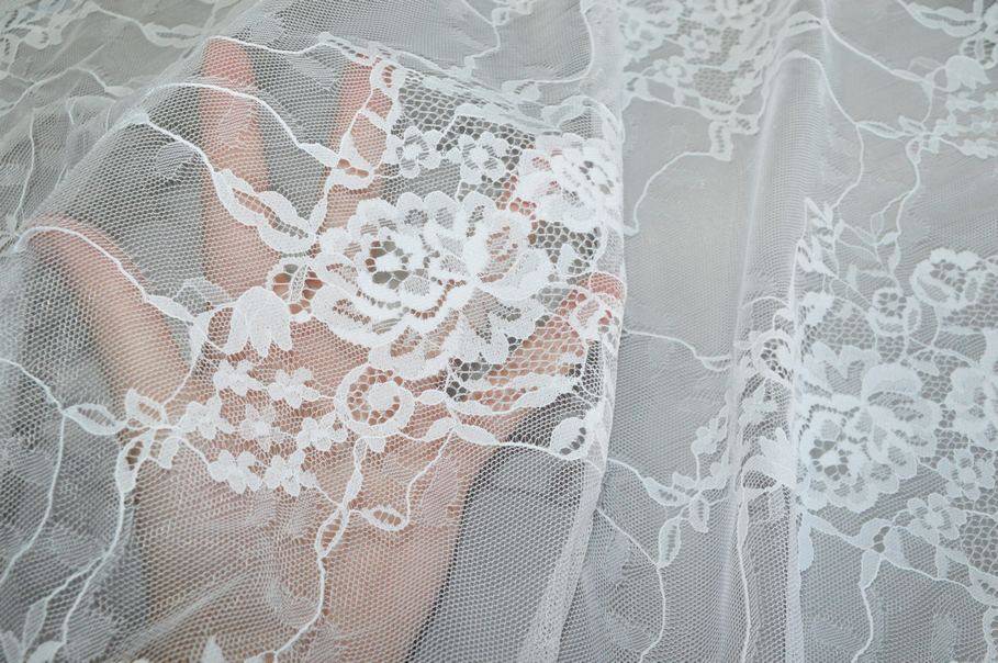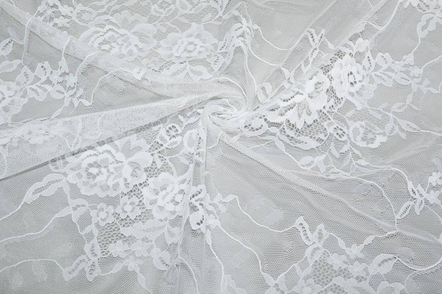 Tessuto di pizzo bianco decorato con un classico ricamo floreale. La sua struttura traforata lo rende morbido, cadente e trasparente. Entrambe le cimose sono smerlate. Questo tessuto è versatile, adatto sia per capi quotidiani che per indumenti più formali. Perfetto per la realizzazione di magliette con effetto vedo non vedo, abitini e inserti su capi già confezionati come maniche in pizzo o balze per allungare un vestito.
