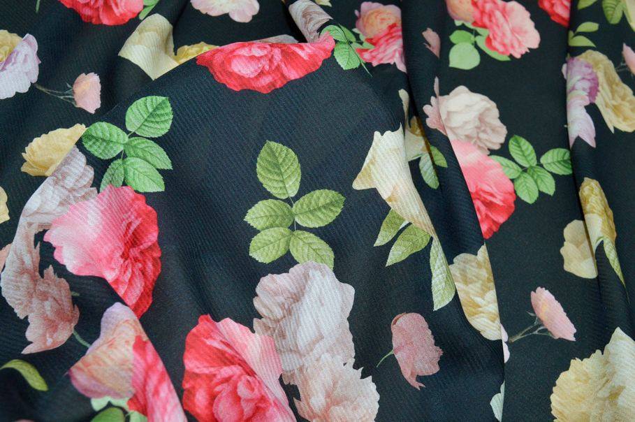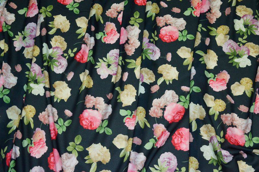 La base nera mette in risalto una vivace fantasia floreale con grandi rose lilla, gialle e rosa intenso, creando un contrasto elegante e d'impatto. Il fondo presenta inoltre una righina nera tono su tono che rende la base particolare ed unica.