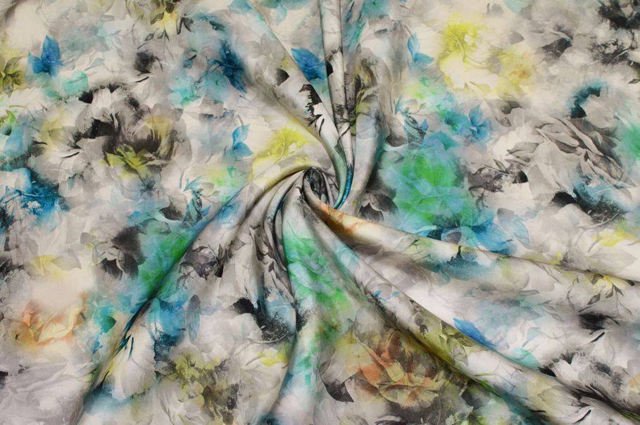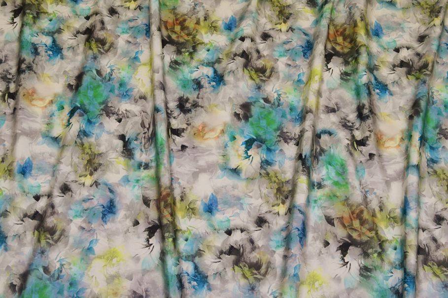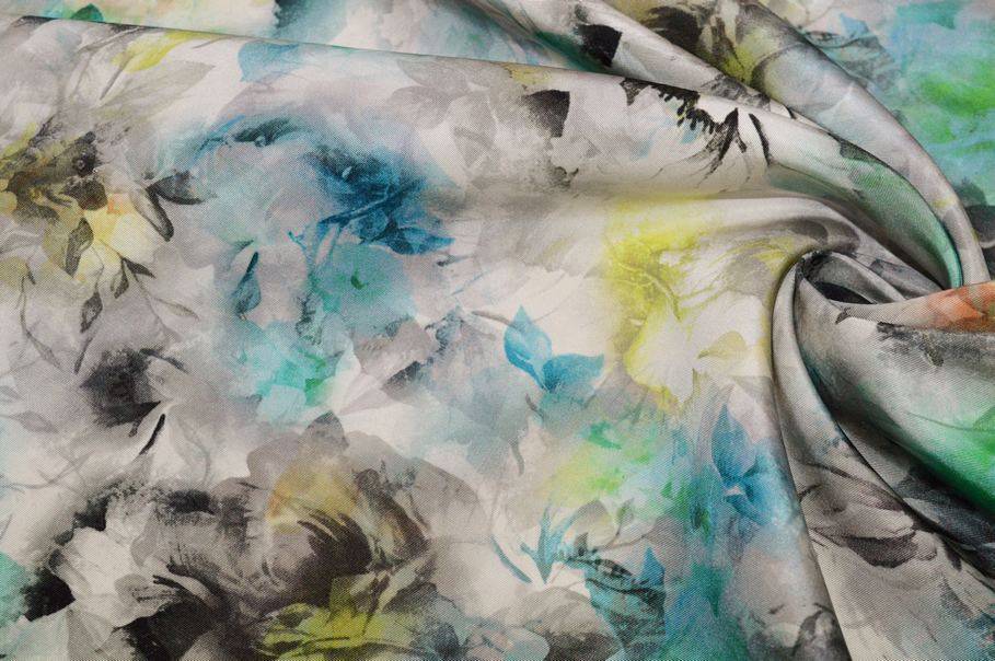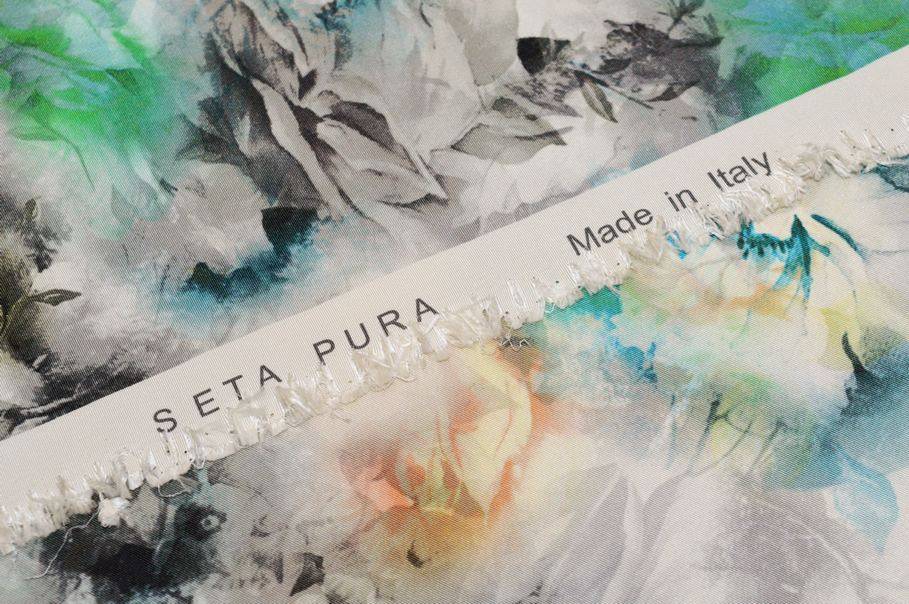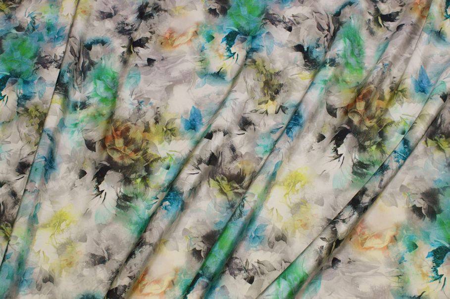 La fantasia presenta una base di rose grigie con alcuni fiori colorati a contrasto nelle tonalità dell'azzurro, verde e giallo flou. L’insieme crea un gioco di degradé e sfumature che dona profondità e originalità al tessuto rendendolo unico nel suo genere.