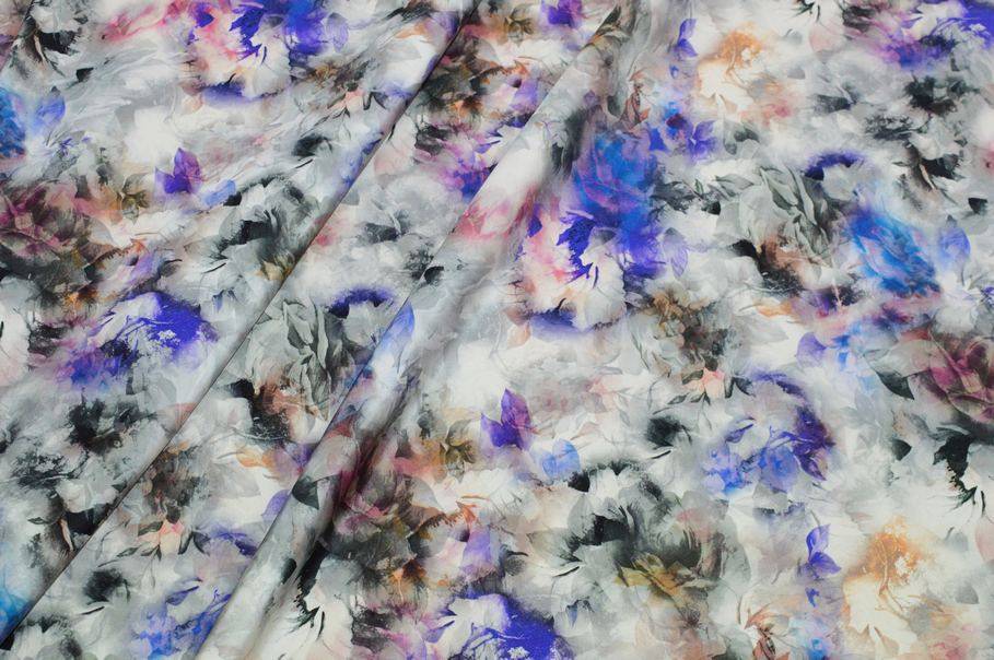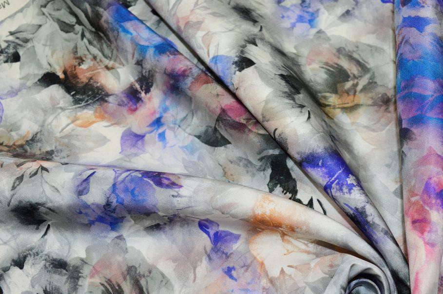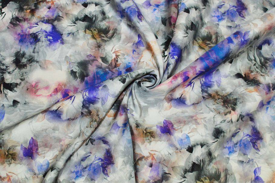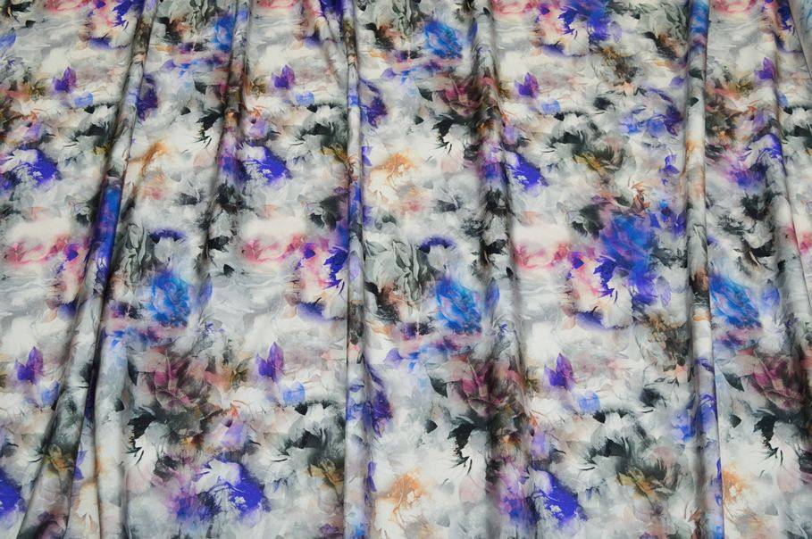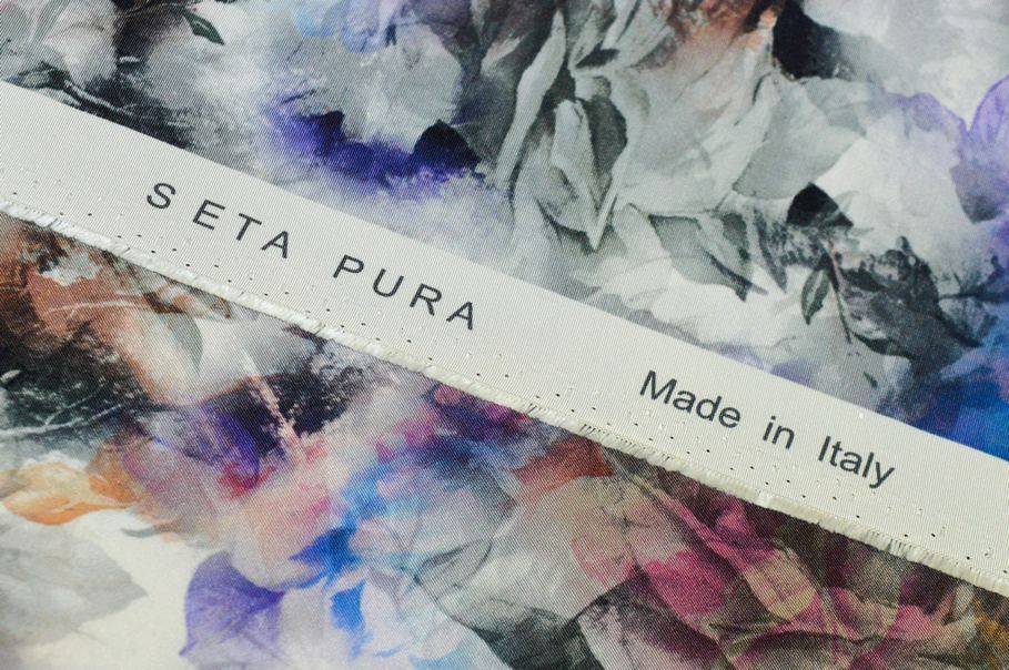 La fantasia presenta una base di rose grigie con alcuni fiori colorati a contrasto nelle tonalità del viola e dell’arancio. L’insieme crea un gioco di degradé e sfumature che dona profondità e originalità al tessuto rendendolo unico nel suo genere.