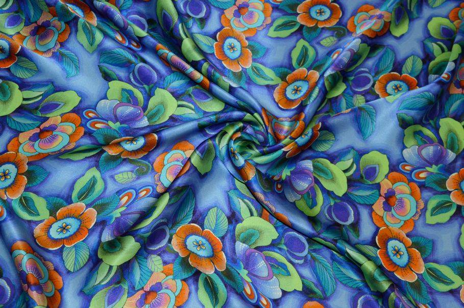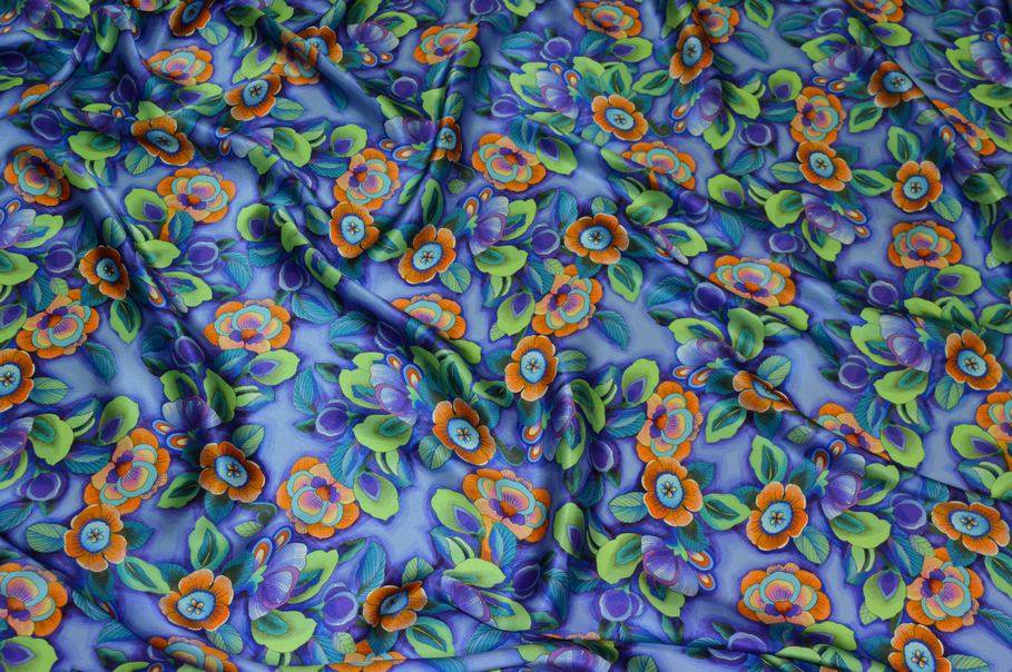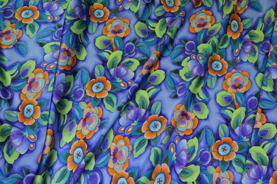 La fantasia presenta un fondo viola chiaro, decorato con fiori stilizzati dai toni sgargianti e vivaci dell'arancio e del viola, creando un contrasto di tonalità brillante, dinamico e giovanile.