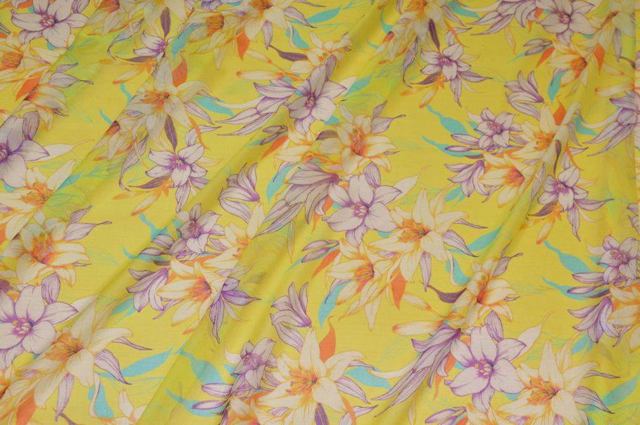 Il fondo del tessuto è di un delicato giallo chiaro a tinta unita, arricchito da una fantasia floreale vivace e giovanile nei toni dell’arancio e del lilla.